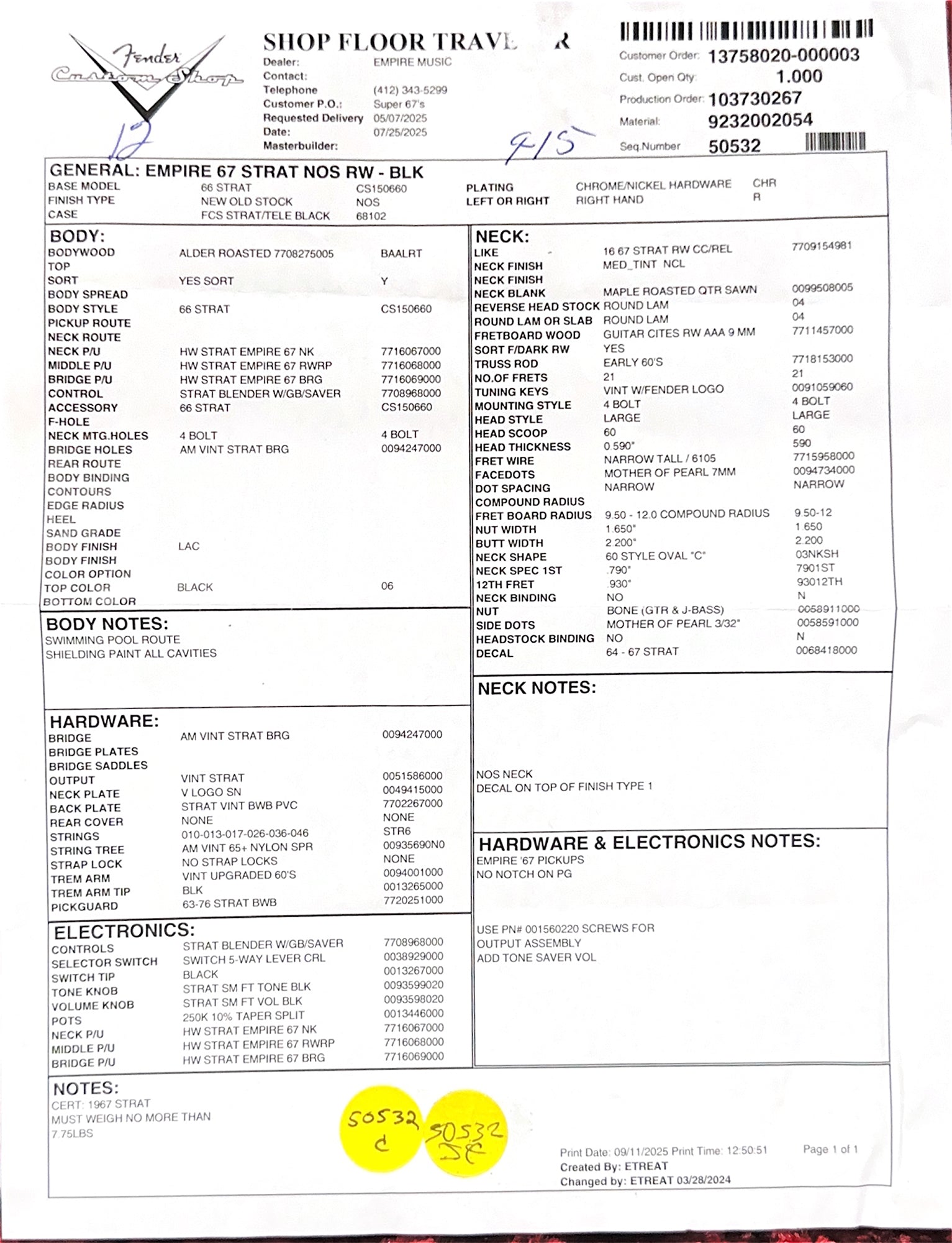 Fender Custom Shop Empire 67 Stratocaster NOS - Black #87674