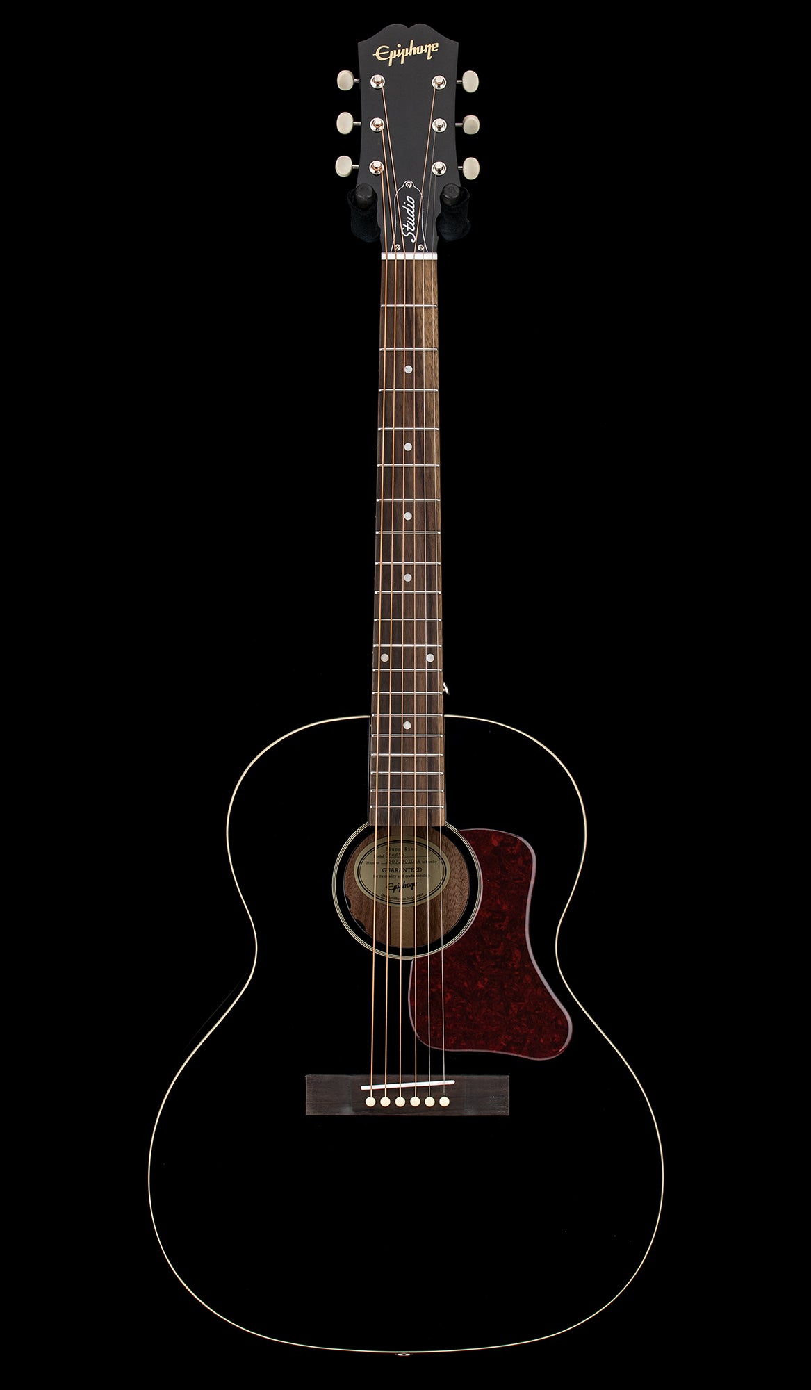 The Blues King Studio has a layered, L-00-style mahogany body with single-ply cream binding on the top and back and a solid spruce top for a responsive, balanced tone with excellent dynamic range that sounds even better as it ages. The mahogany neck is attached to the body with a glued-in tapered dovetail neck-to-body joint and features a comfortable Rounded C profile. The neck is capped with a rosewood fretboard equipped with 19 standard frets and adorned with simple pearloid dot inlays. The other ends of the strings are routed over a compensated plastic saddle and are anchored to the rectangular rosewood bridge with ivory-colored bridge pins. We also included other details that give the Blues King Studio even more vintage-style flair, including an L-00-shaped dark tortoise shell-colored pickguard, three-on-a-plate tuners with ivory-colored plastic buttons, and a 60s Kalamazoo-style headstock with the Epiphone logo proudly displayed in gold silkscreen.