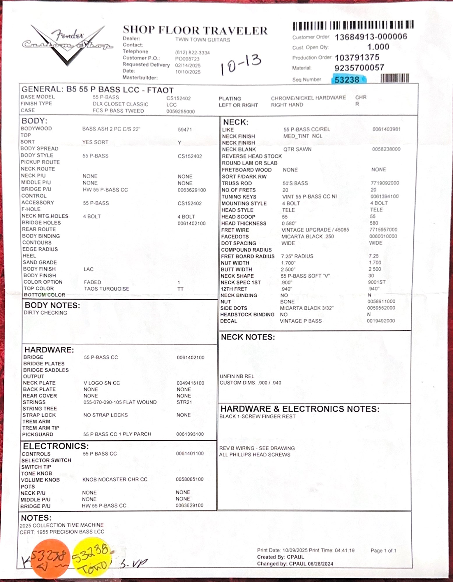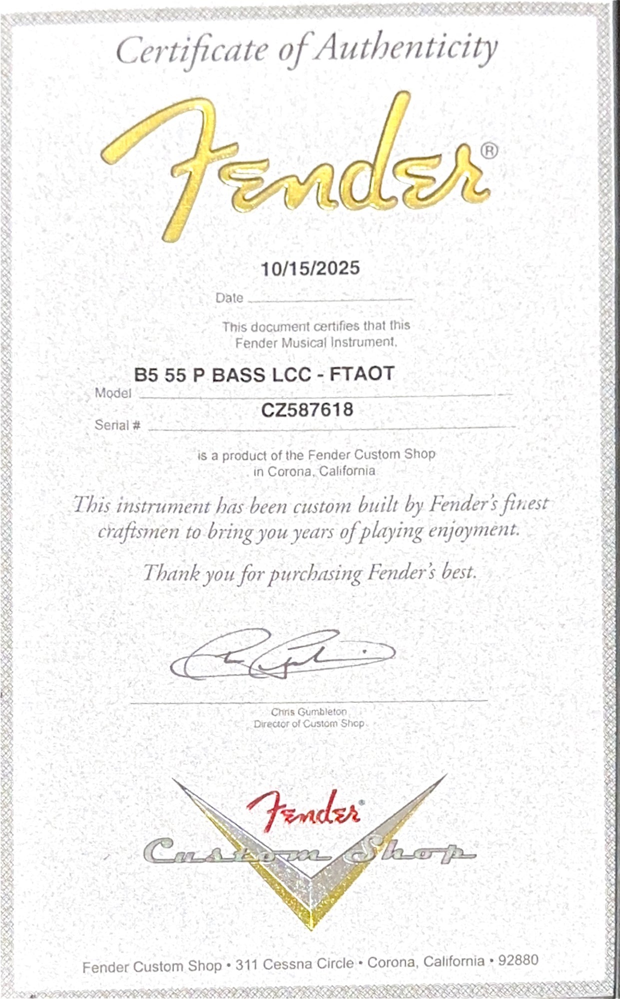 Other premium features include 7.25" (184.1 mm) Radius, '55 Precision Bass® Wiring, 1-Ply Parchment Pickguard, 2-Saddle Vintage-Style Precision Bass® Bridge, Vintage-Style Tuning Machines, Bone Nut, Vintage-Style Disc String Tree, Deluxe Hardshell Case, Strap, Certificate of Authenticity.