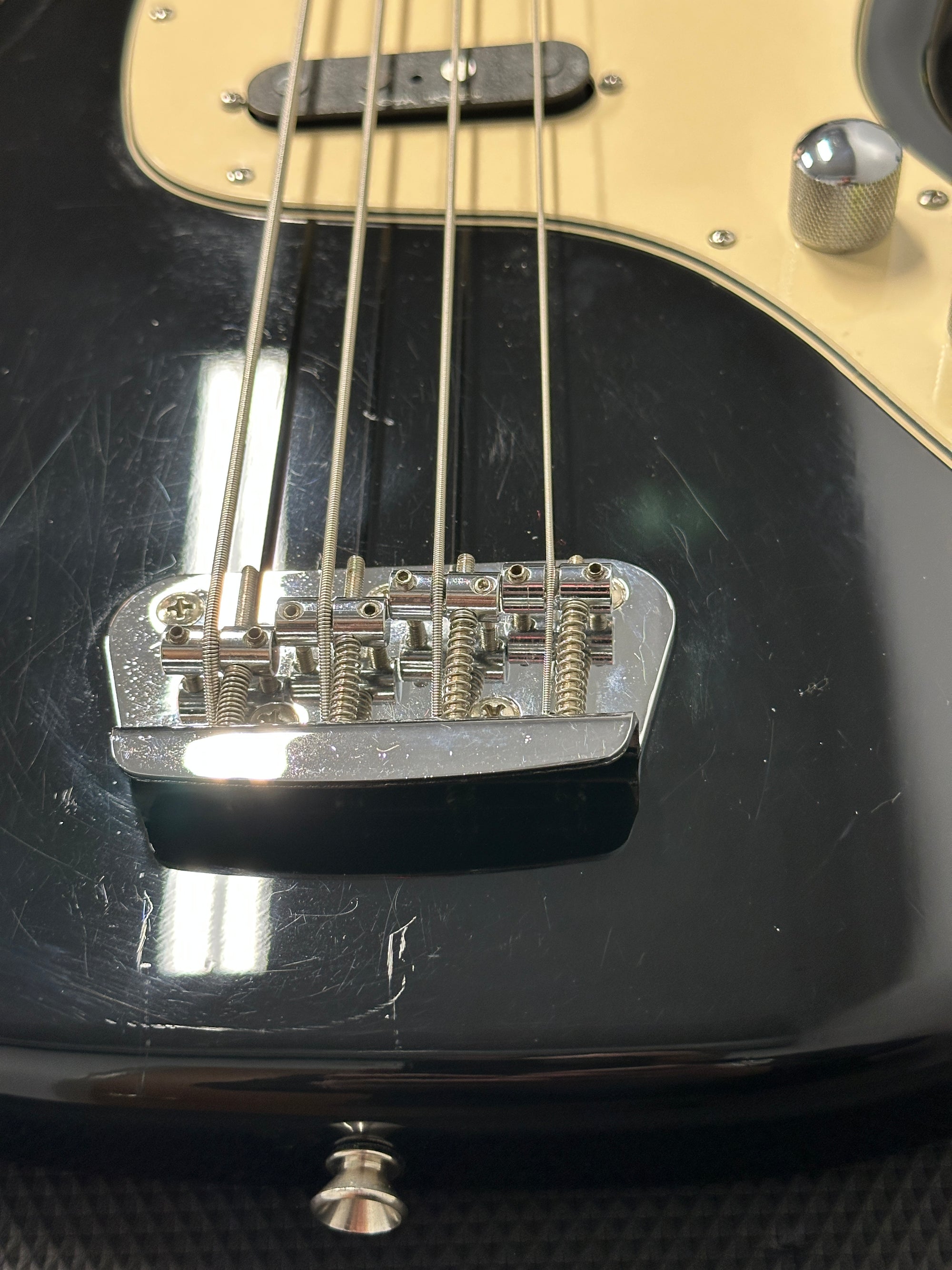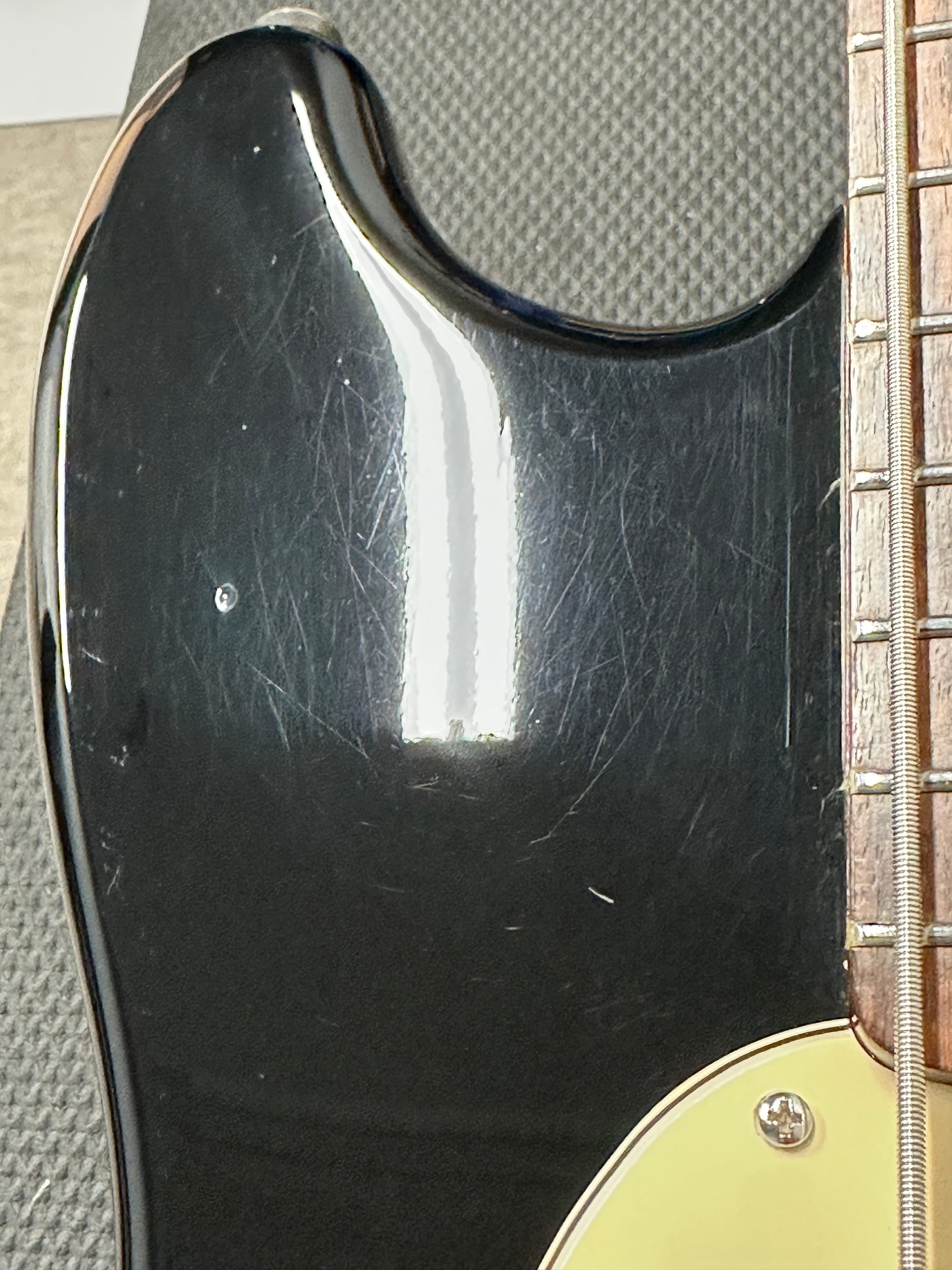 This Squier Musicmaster Bass is in GOOD overall condition. Cosmetically, it is in good shape but does show a heavy amount of wear/blemishes. This is a used instrument, so it will have finish scratching and playwear. Any significant marks will be mentioned in the description. All used models receive a full factory setup and hand-inspection before shipping.