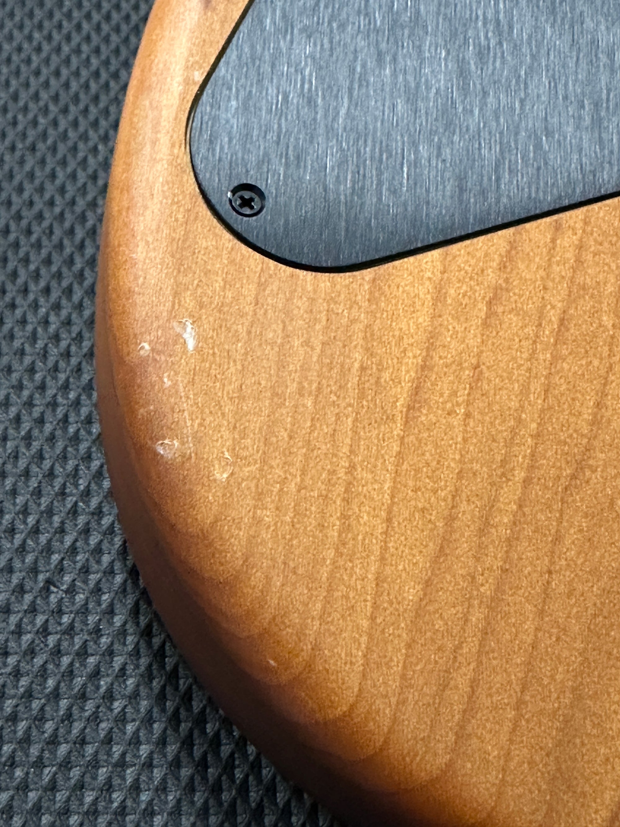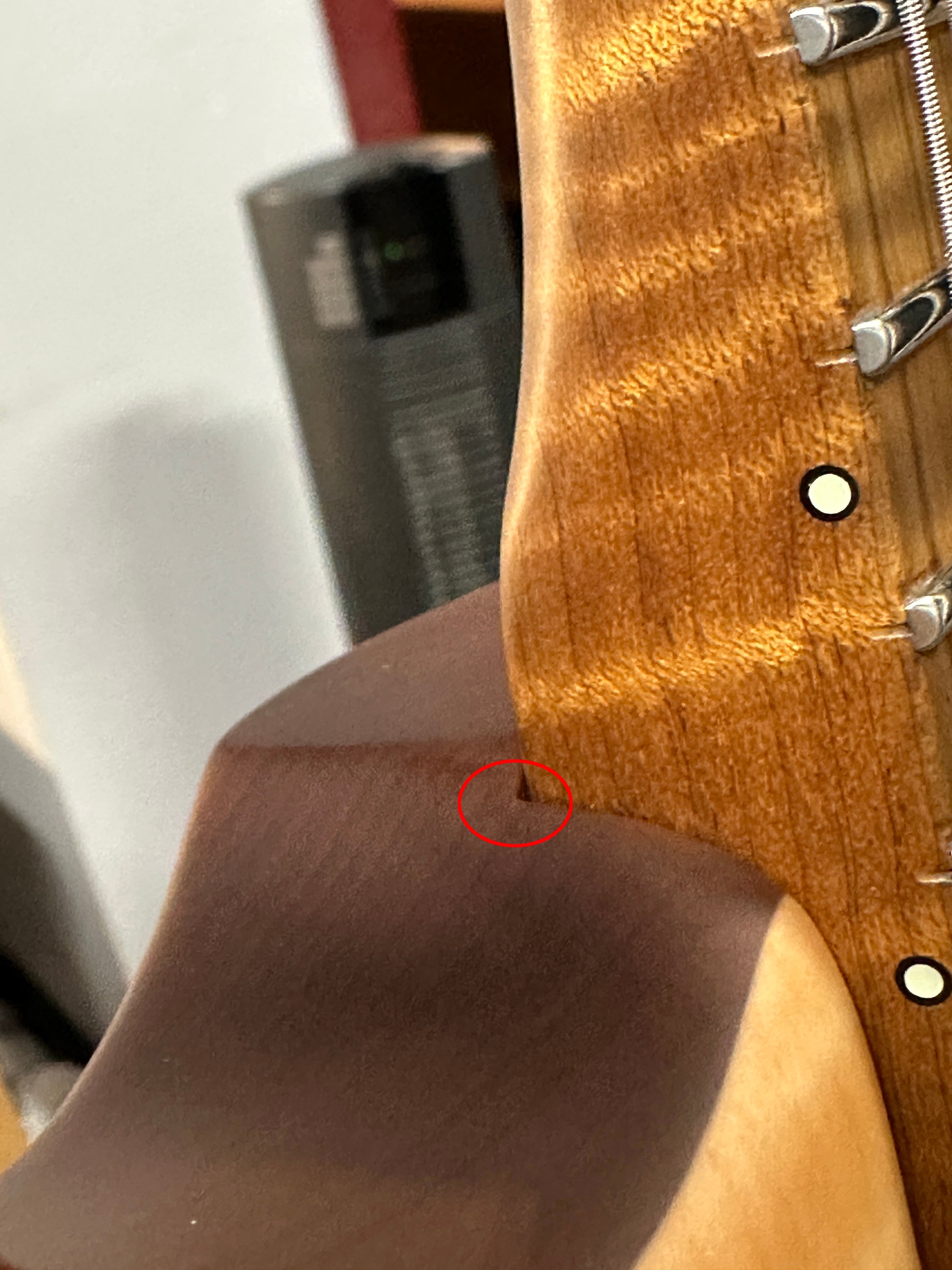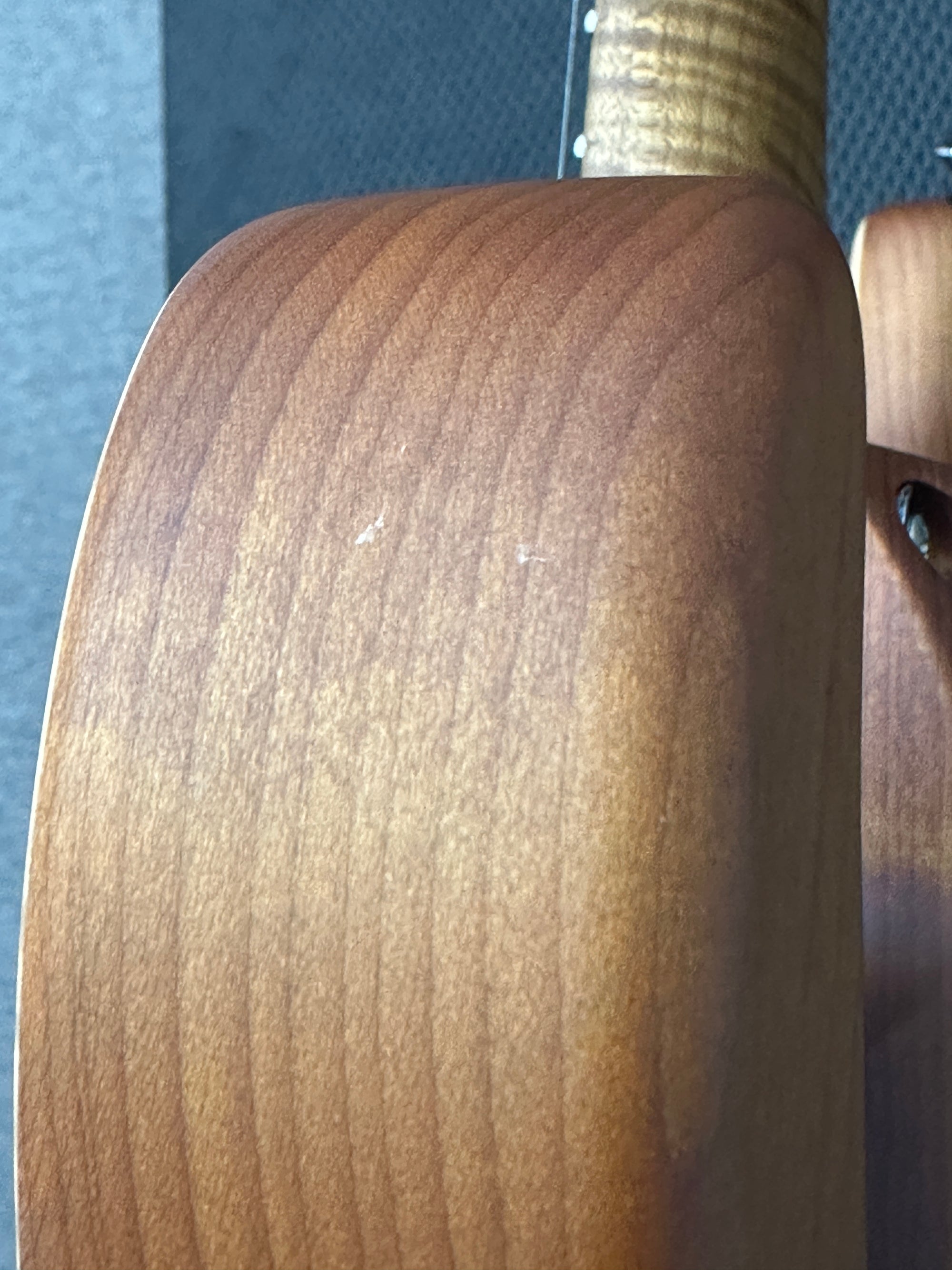Note: After close inspection, this instrument has a very small heel crack low E string side, scuffs, chipping/impressions, and scratching. (See pics)