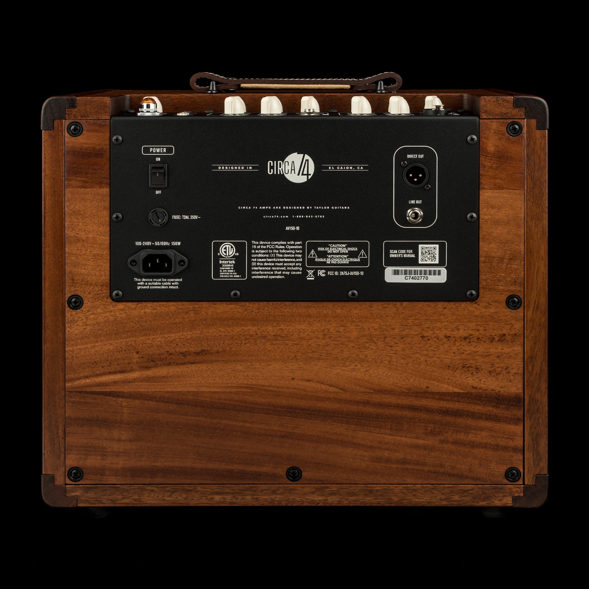 The Circa 74 amp was designed to dial down the high-end harshness found in many acoustic amps and produce a warm, analog musical character. The sound is smooth, yet without sacrificing articulation. One important material choice was to build a wood cabinet for the amp — choose from mahogany or ebony/mahogany — leveraging Taylor’s tonewood voicing expertise to contribute to the amp’s smooth sound palette and room-filling sound.