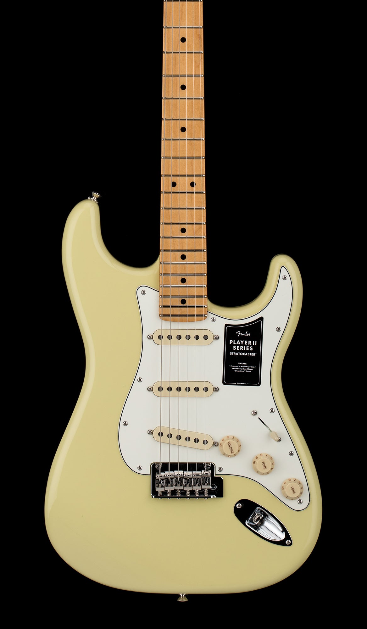 Step into the spotlight and experience iconic Fender® sound and style with the Player II Stratocaster® — a stage-ready guitar with contemporary updates to power your performance and inspire your playing. The Player II Stratocaster radiates timeless Fender charm, but under the hood, it’s primed for today’s players. Everything about the neck is designed for fast and fluid playability, from the Modern “C”-profile with silky satin urethane finish on the back to the comfy 9.5”-radius slab rosewood or maple fingerboard with smooth rolled edges and 22 medium jumbo frets. Choose from alder, chambered ash or chambered mahogany bodies available in both classic Fender finishes and never-before-seen colors unearthed from the archives. Player Series Alnico V Single-Coil Strat® pickups offer crystalline highs, musical mids and tight lows that elevate any genre. The 5-way blade switch lets you dial in everything from glassy neck pickup cleans to rowdy bridge pickup snarl and all points in between, while a 2-point tremolo and Classic Gear™ tuners ensure precise tuning stability for the flexibility to explore endless sonic possibilities. Perfect for crafting your own sound, the Player II Stratocaster has the looks, tone and feel that only a Fender delivers.