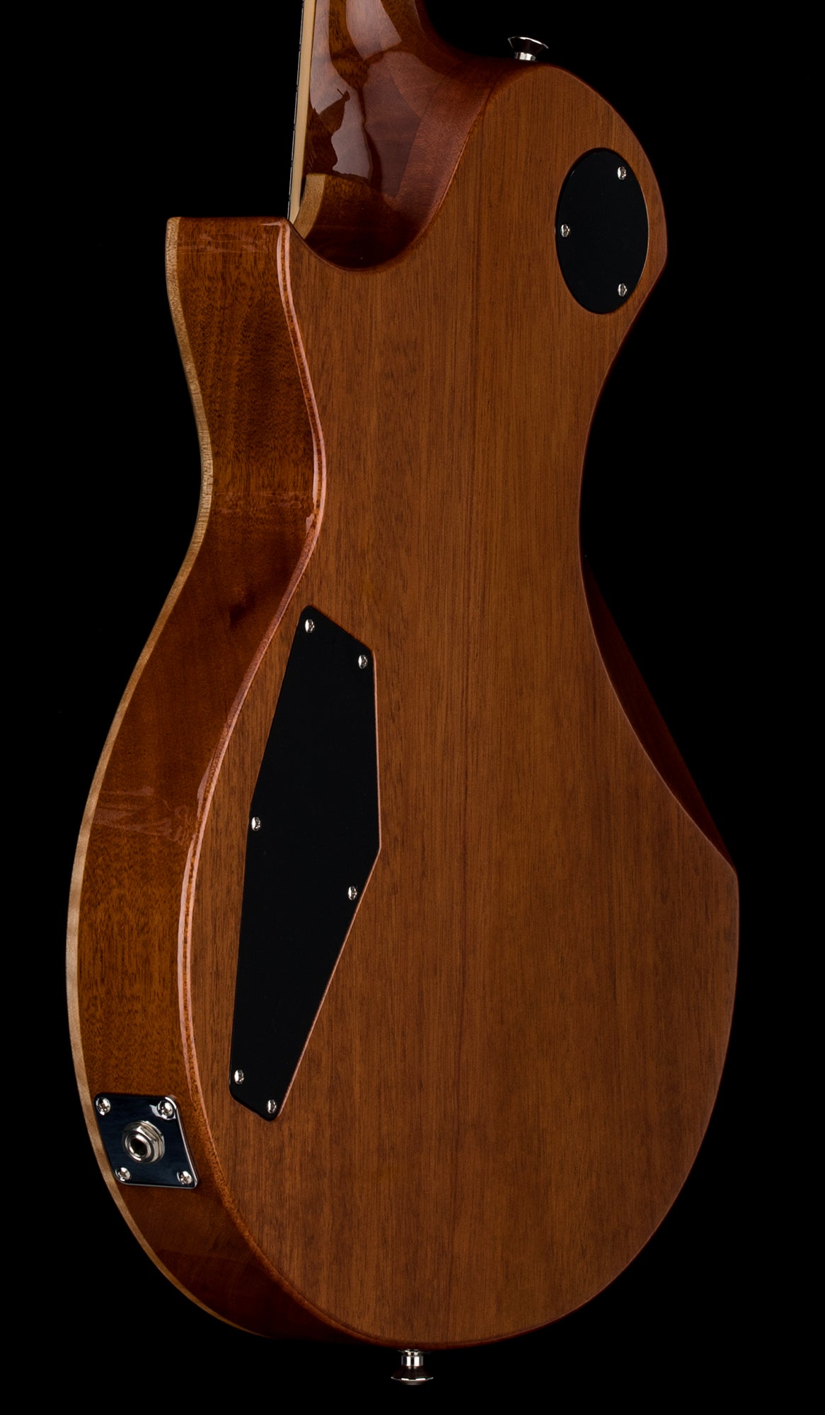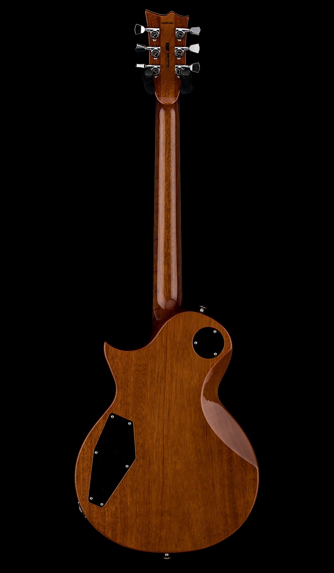 It features a full-thickness mahogany body (60mm / 2 3/8”), strategically weight relieved. It is built at classic 24.75” scale using set-thru construction for smooth access to the higher frets, using a three-piece thin U-shaped mahogany neck and ebony fingerboard with 22 extra-jumbo Jescar stainless steel frets and mother-of-pearl split-flag inlays.