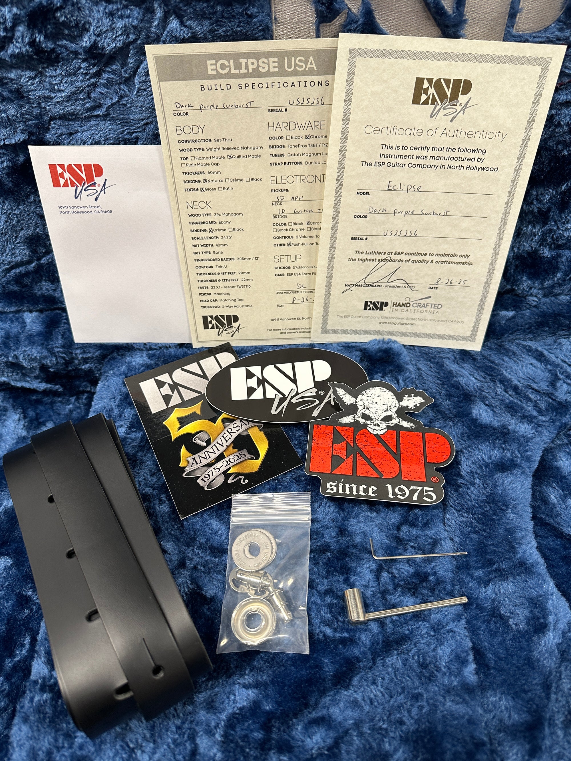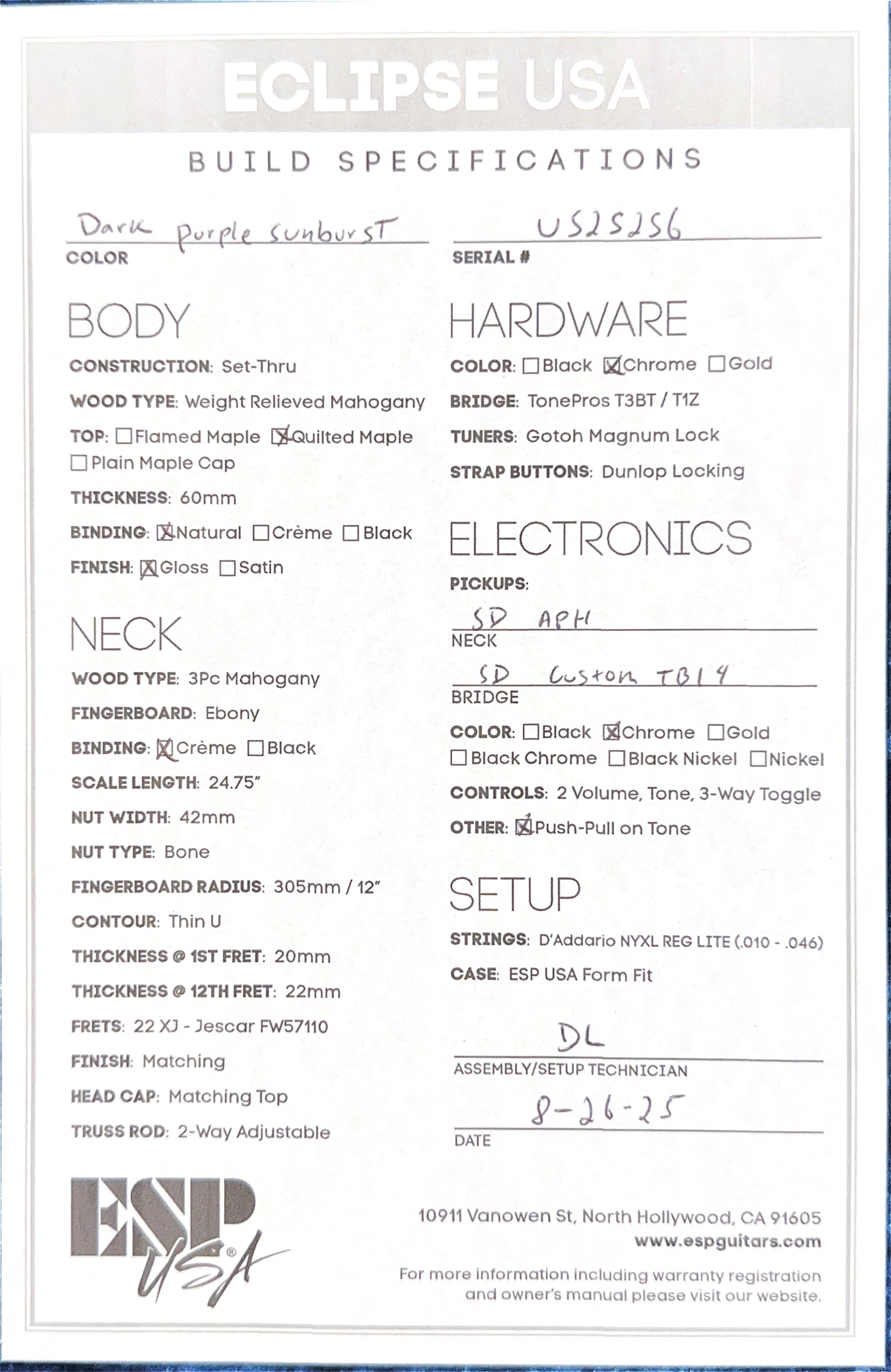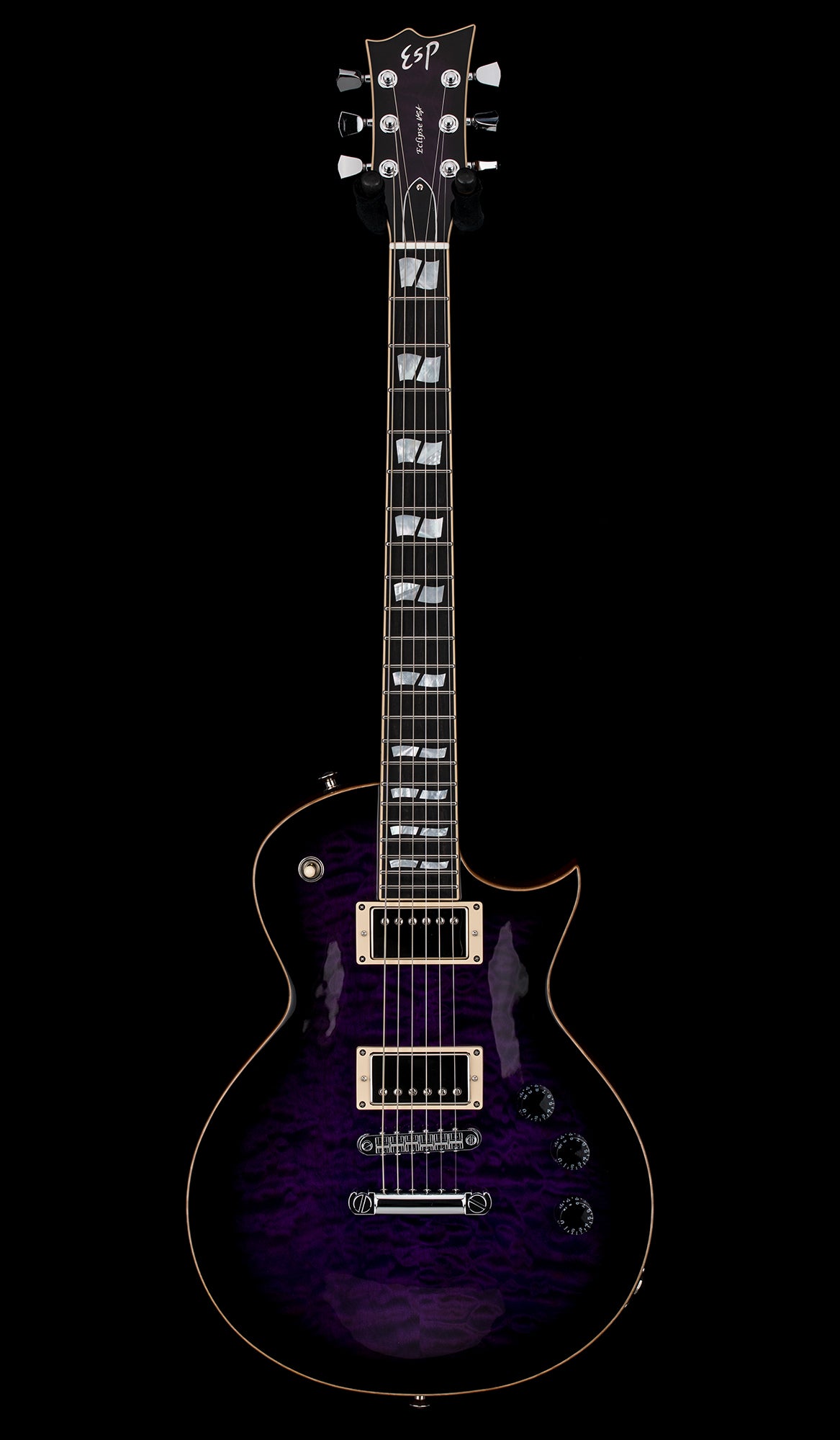 This Eclipse USA comes with a Dark Purple Sunburst finish, quilted maple top, Seymour Duncan pickups, and chrome hardware. Built to go beyond the highest standards in custom guitar design, the Eclipse USA offers only the best in components and build materials. It includes a custom ESP USA form-fitting hardshell case, and an official Certificate of Authenticity from ESP.