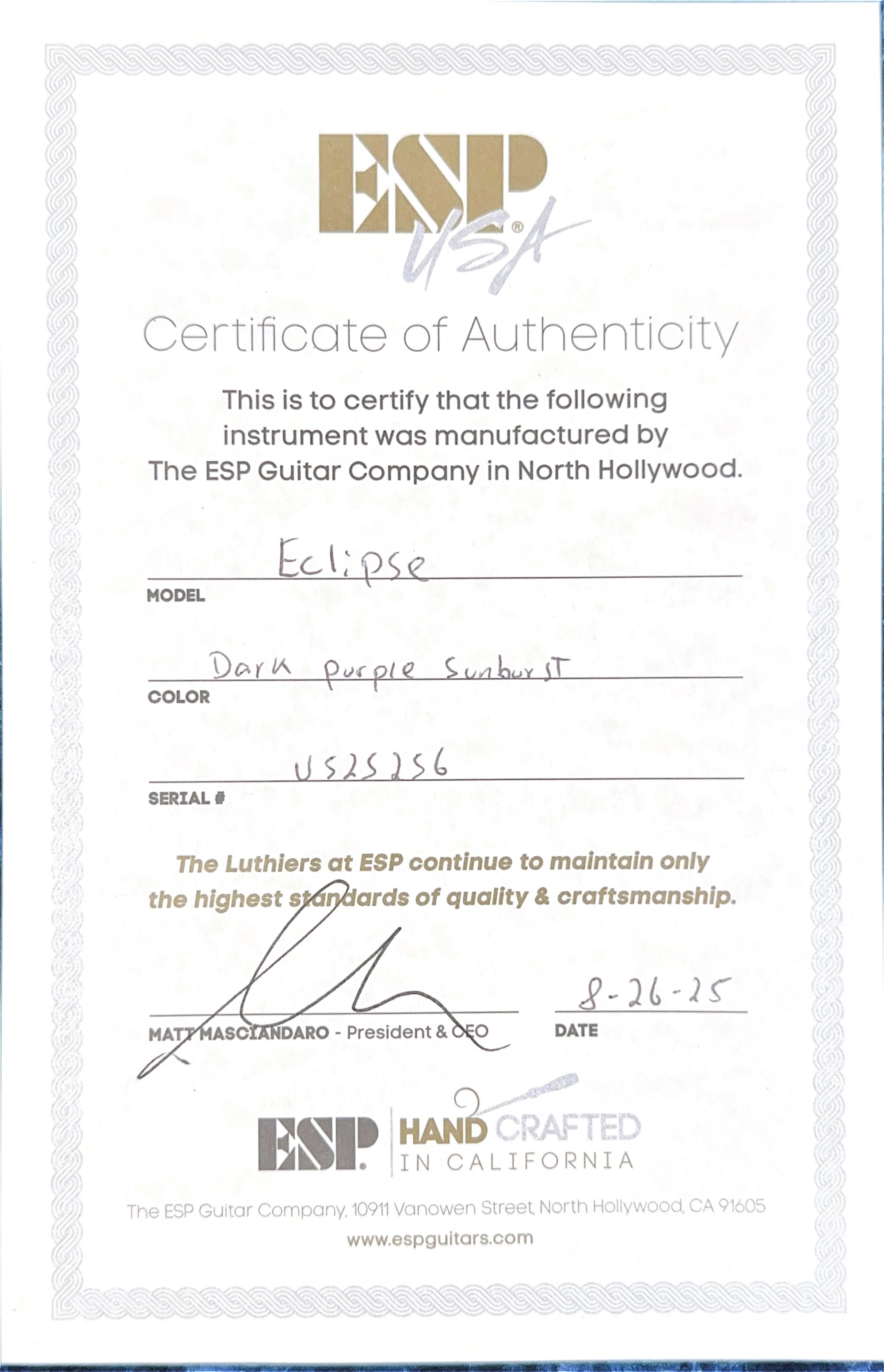 The guitar pictured is the actual guitar that you will receive. It comes with ESP's Factory Warranty and our 100% satisfaction guarantee! It will be professionally set up and ready to play before it leaves our store.