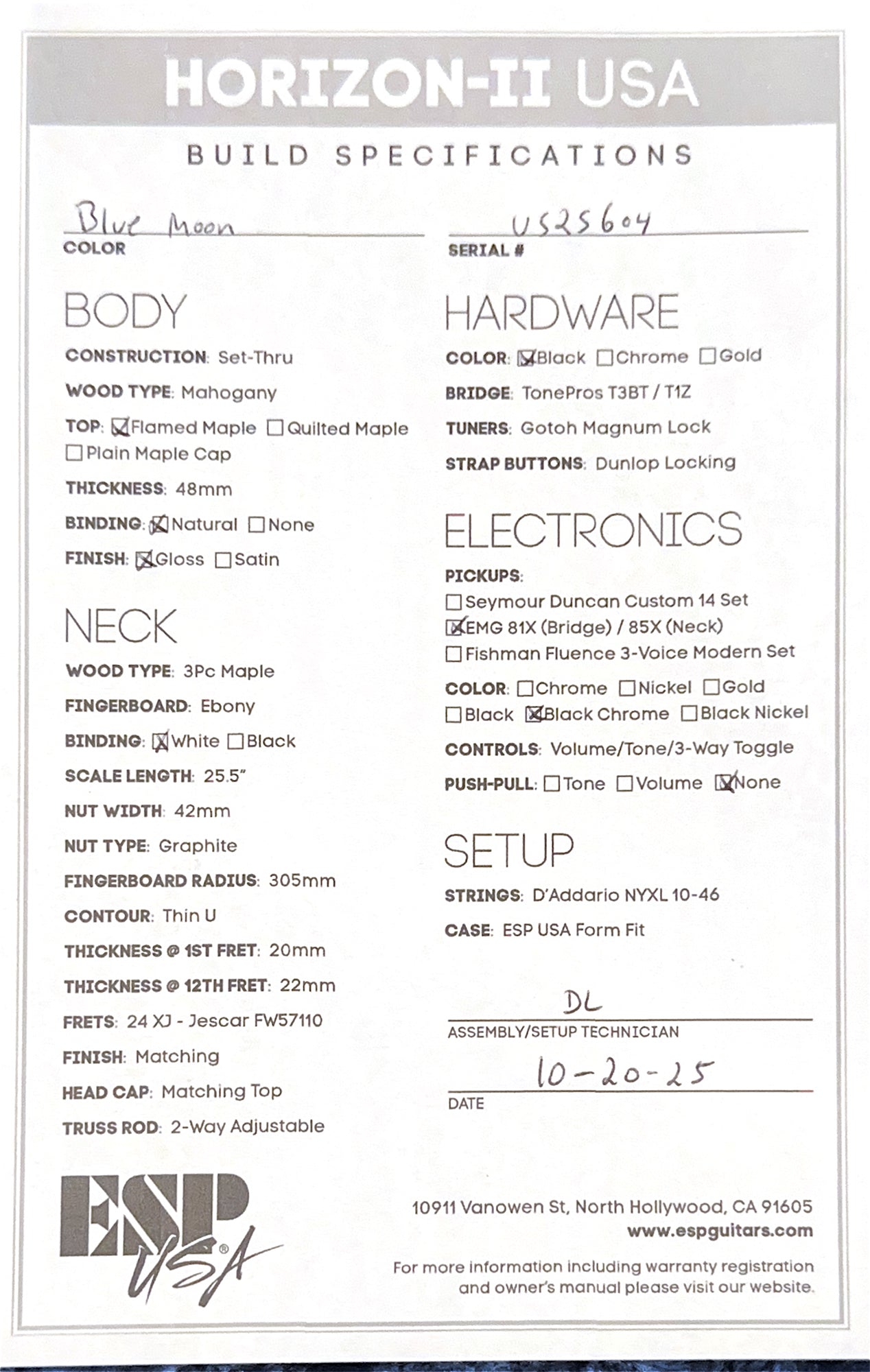The Horizon-II USA includes a custom ESP USA form-fitting hardshell case, and an official Certificate of Authenticity from ESP.