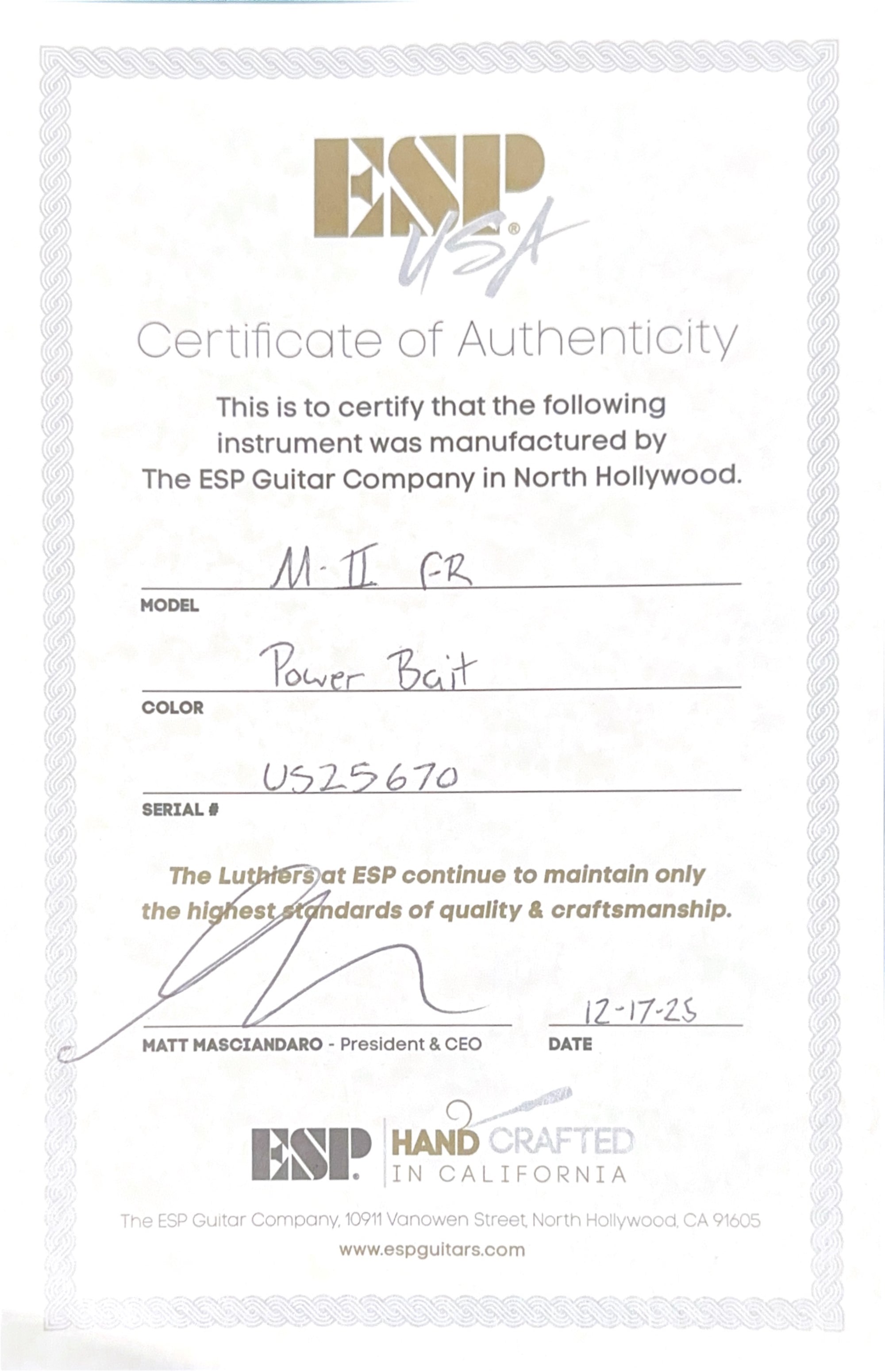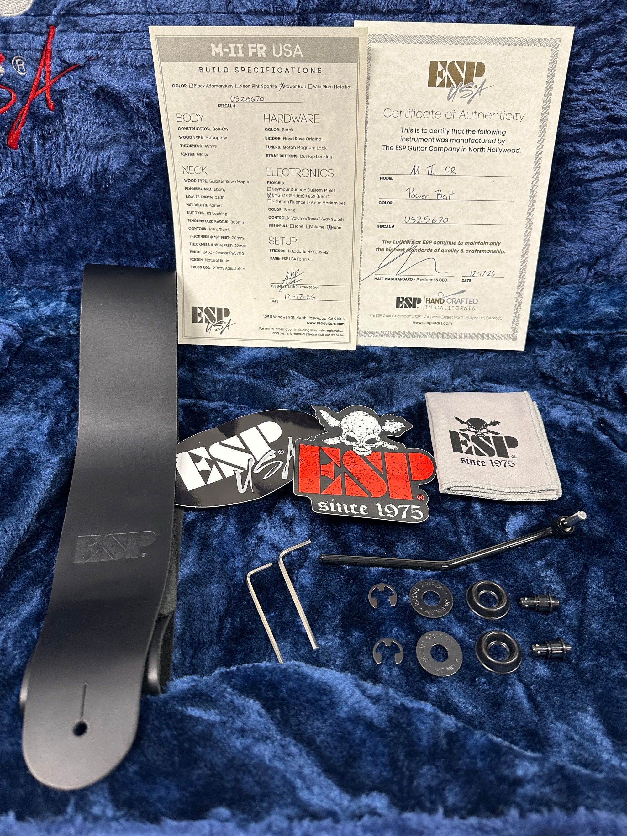 The M-II FR USA includes a custom ESP USA form-fitting hardshell case, and an official Certificate of Authenticity from ESP.