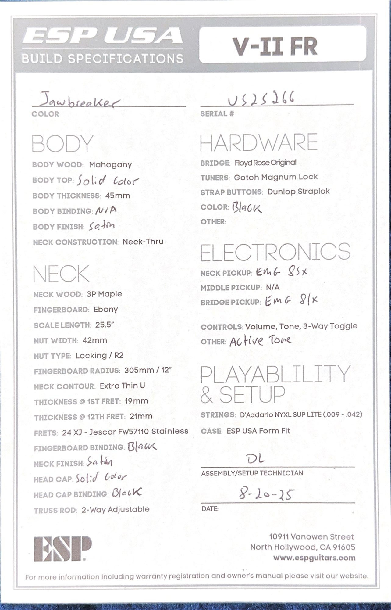 The V-II FR USA is handcrafted by the expert luthiers in our ESP USA shop in Southern California, and you won’t find a more high-quality, well-equipped V-style guitar from any manufacturer at any price.