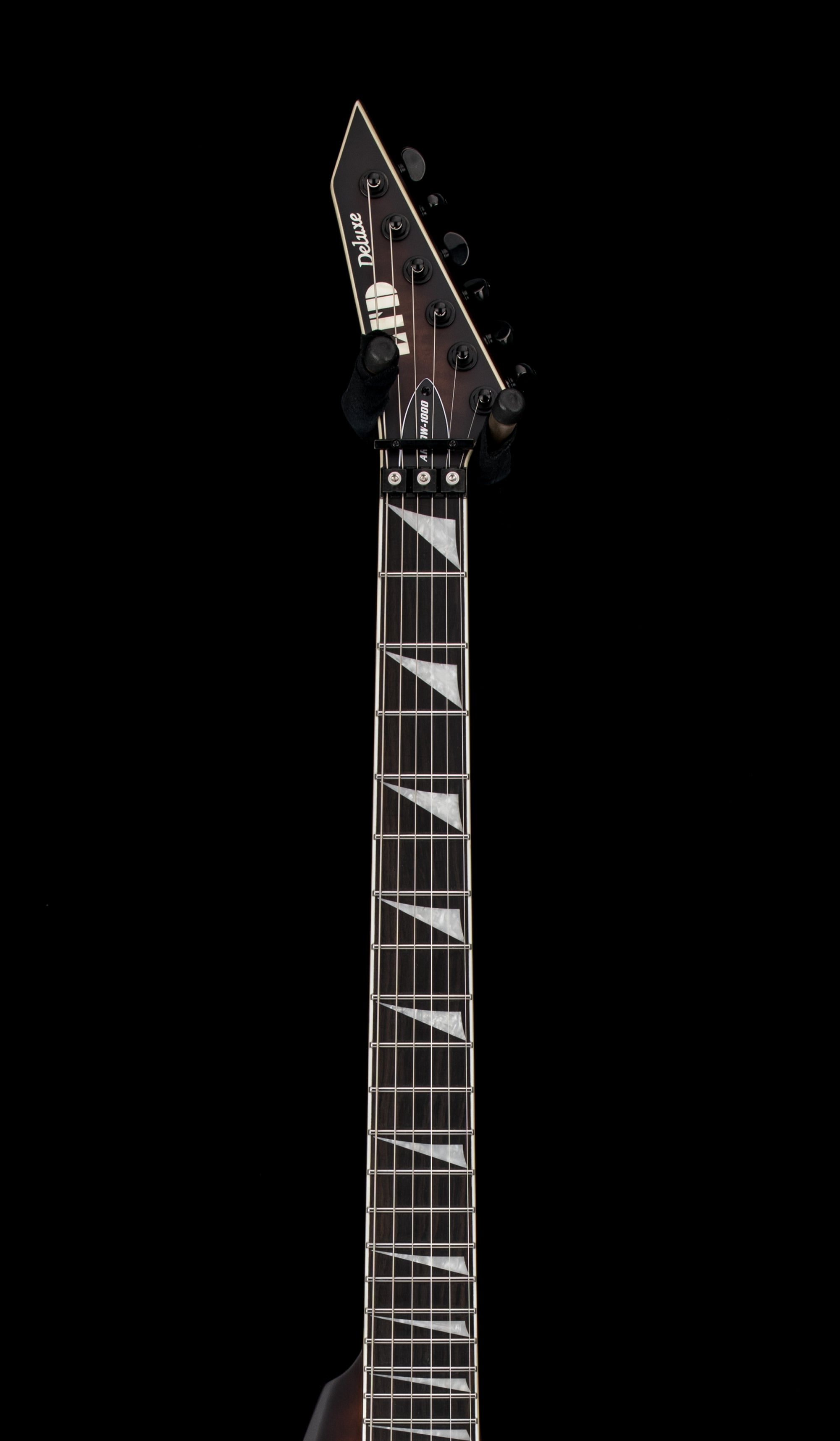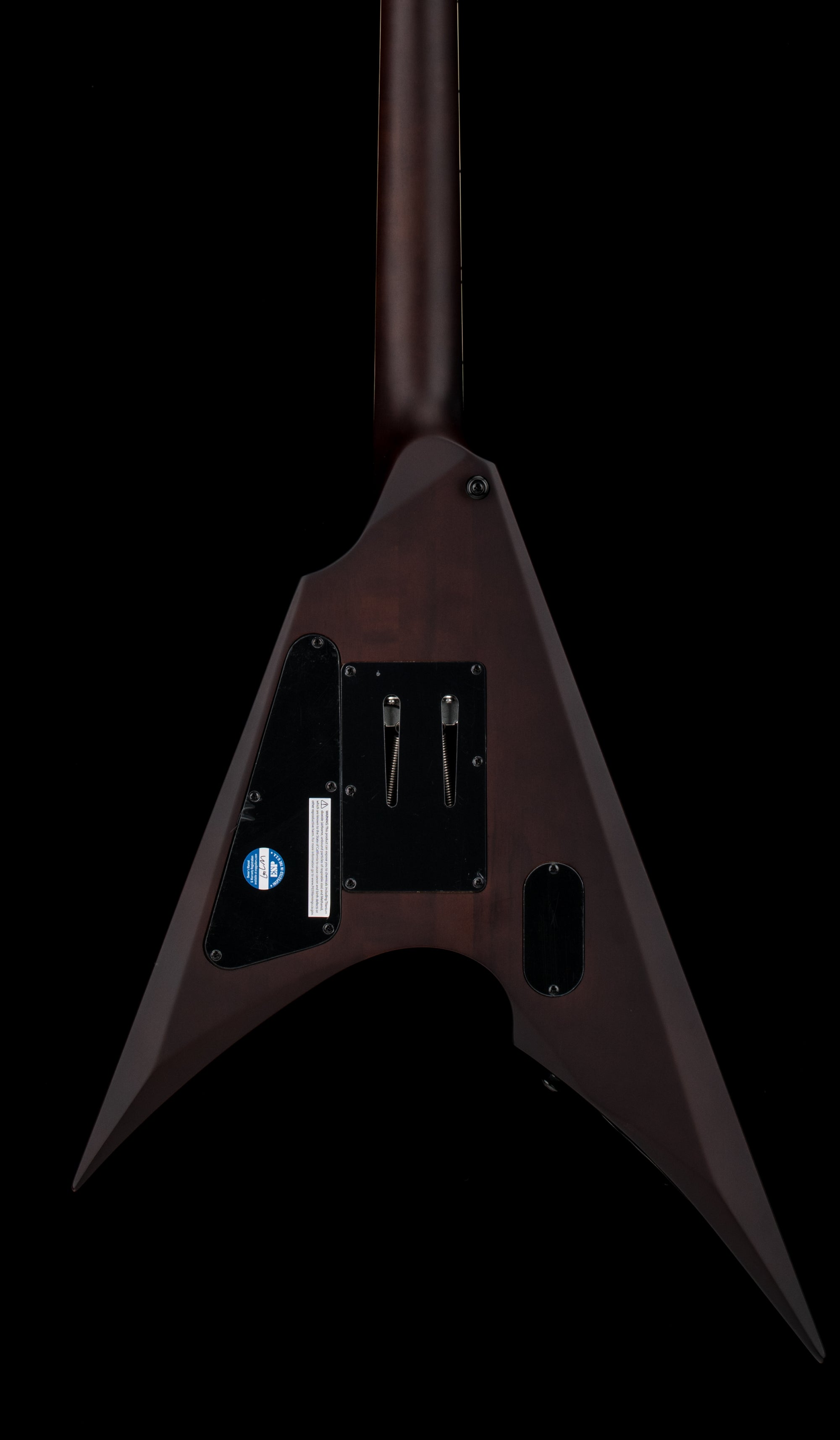 With its beveled body and completely unique V shape, this Arrow-1000 stands out from the crowd with its figured quilted maple top, looking superb in Dark Brown Sunburst Satin finish. It features neck-thru-body construction at 25.5” scale with a mahogany body. Its extra-thin u-shaped three-piece maple neck has a compound radius for improved playing comfort, and features a reverse headstock with matching finish, Macassar ebony fingerboard with triangular white pearloid inlays, and 24 extra-jumbo stainless steel frets. The Arrow-1000 includes a set of direct-mount Fishman Fluence Modern Humbucker active pickups (ceramic in the bridge and alnico in the neck), with push-pull control to select voicings and black nickel covers to match this guitar’s outstanding aesthetics. Each pickup offers two voices. With the ceramic bridge pickup, Voice 1 is the ultimate high-output ceramic humbucker bridge pickup tone… crisp, searing crunch, tight bass with no mud, and a growl. Voice 2 delivers modern passive attack performance that has superbly organic distortion characteristics with outstanding dynamics and response. The alnico neck pickup’s Voice 1 is Fishman’s modern active high-output tone, offering the ideal active alnico sound: full, round, and boosted, but with unprecedented articulation and dynamics. Voice 2 gives you the crisp, clean and fluid neck humbucker tone you’ve always wanted. Other components on the Arrow-1000 include a Floyd Rose 1000SE bridge with stainless steel screws and precise Grover tuners.