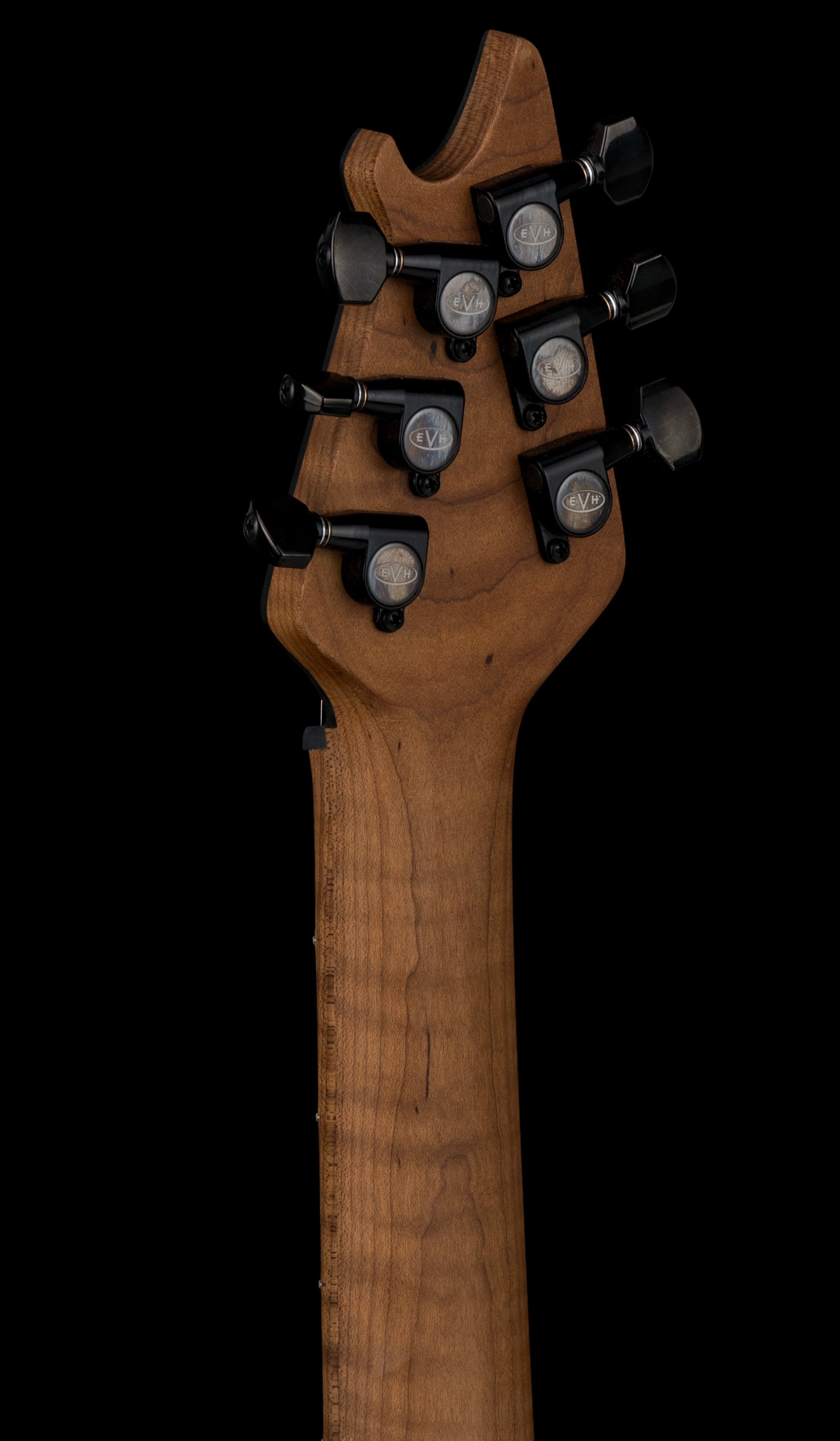This Custom Shop Wolfgang features a caramelized flame maple neck and fingerboard with pearloid Wolfgang 12th-fret inlay, 22 stainless steel frets, 12-16" compound radius, 1-5/8" graphite nut, EVH tuners, TonePros Tune-O-Matic bridge and tailpiece, black hardware, cooked ash body with soft leaf maple top, Bare Knuckle Black Hawk in the bridge position, and a Bare Knuckle Cobra in the neck position.