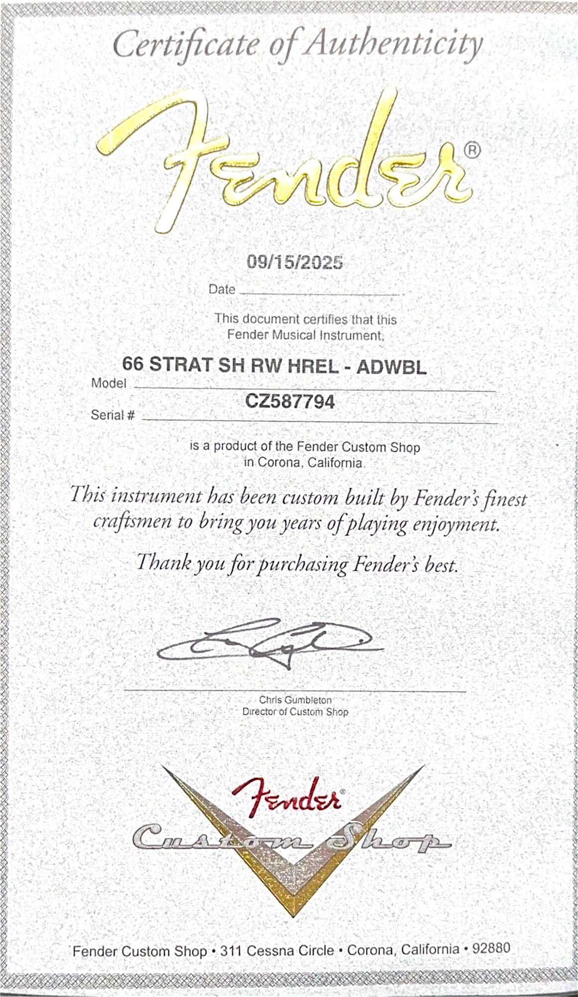 Our Custom Shop Authorized technicians complete a full professional factory-spec setup and inspection before shipping or in-store pickup, ensuring an extraordinary playing experience!