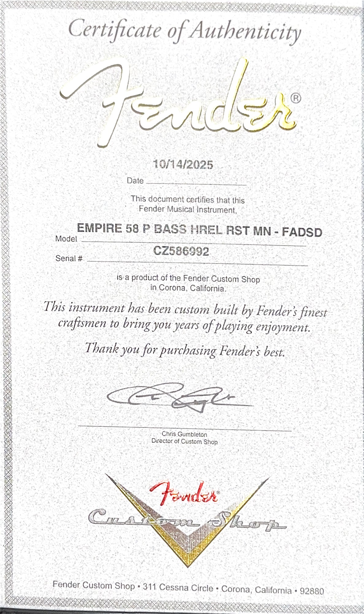 The Fender Custom Shop Empire 58 Precision Bass was designed in-house by our resident bassist and Director of Sales, Anthony Pecora. Based off of his very own 58 Custom Shop P with a few nods to the 60’s models, this bass takes the best from both eras into a player-centric package.