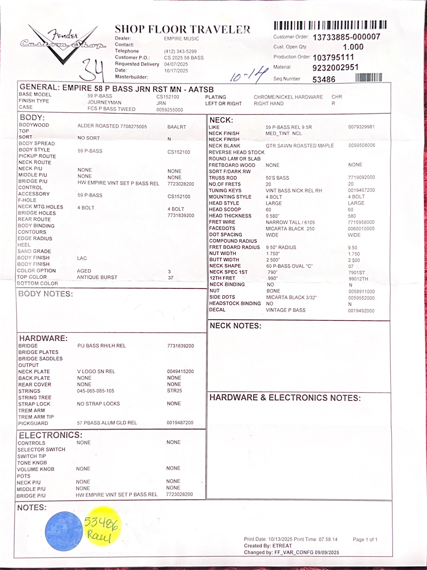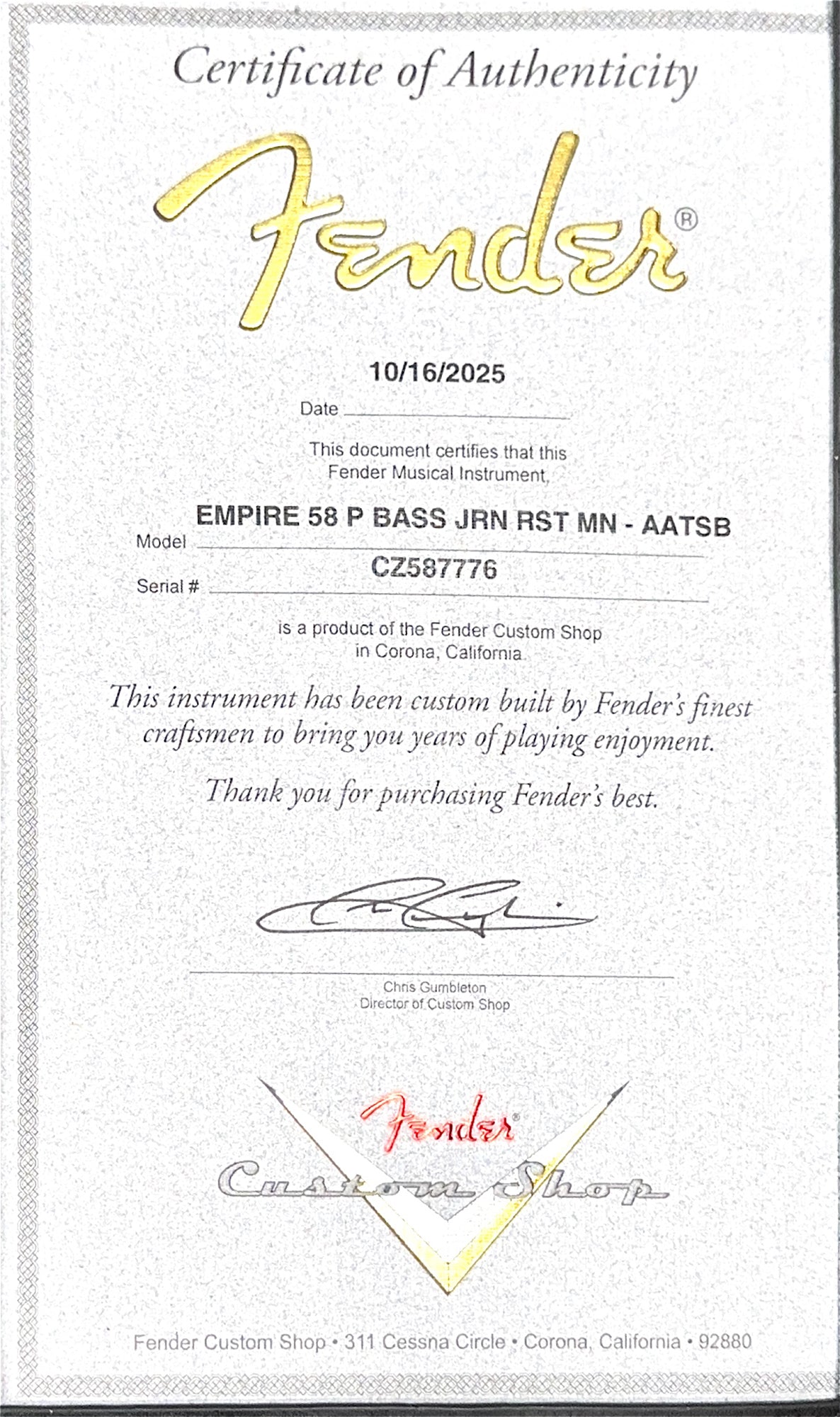 The Fender Custom Shop Empire 58 Precision Bass was designed in-house by our resident bassist and Director of Sales, Anthony Pecora. Based off of his very own 58 Custom Shop P with a few nods to the 60’s models, this bass takes the best from both eras into a player-centric package.