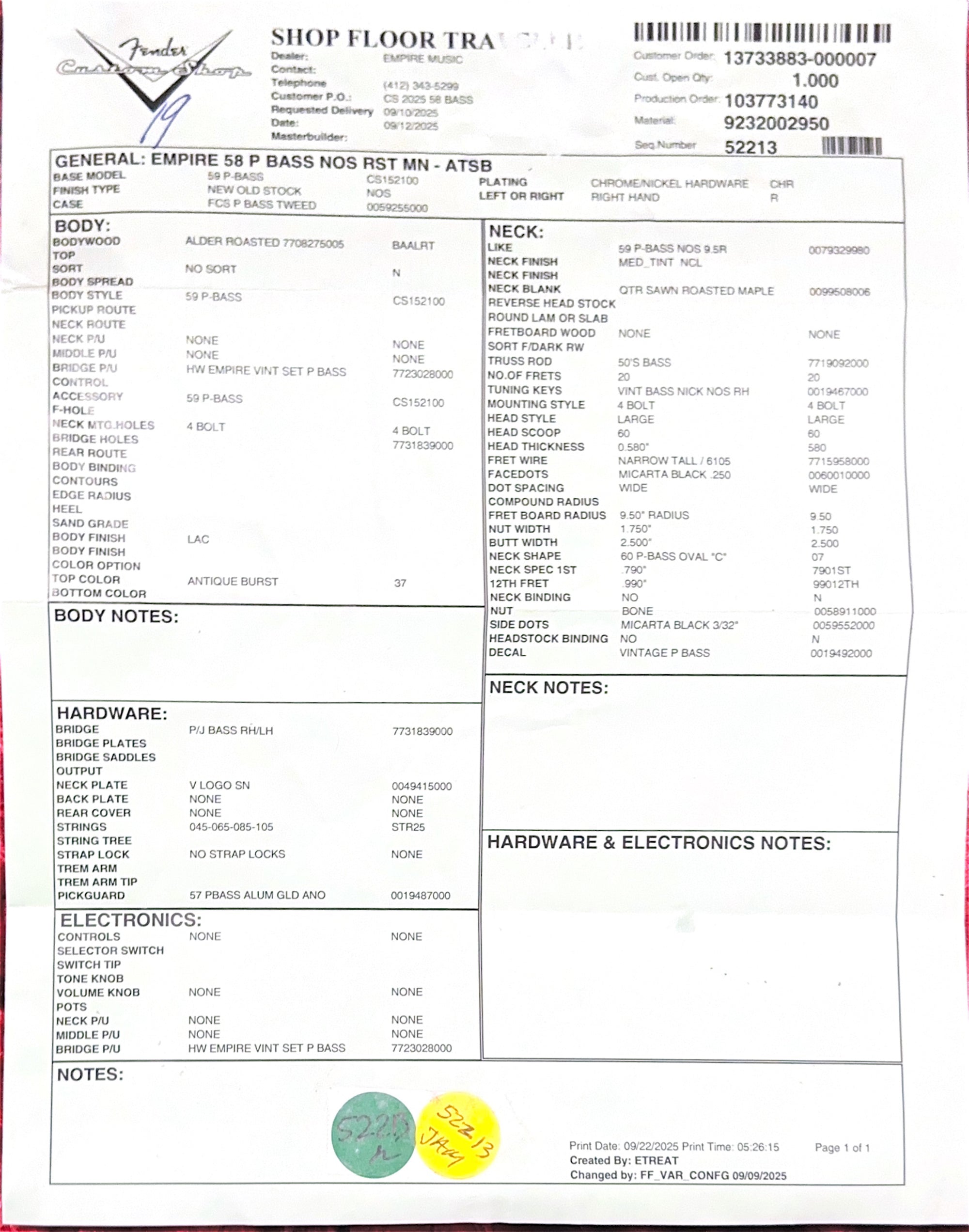 Fender Custom Shop Empire 58 Precision Bass NOS - Antique Burst #88828