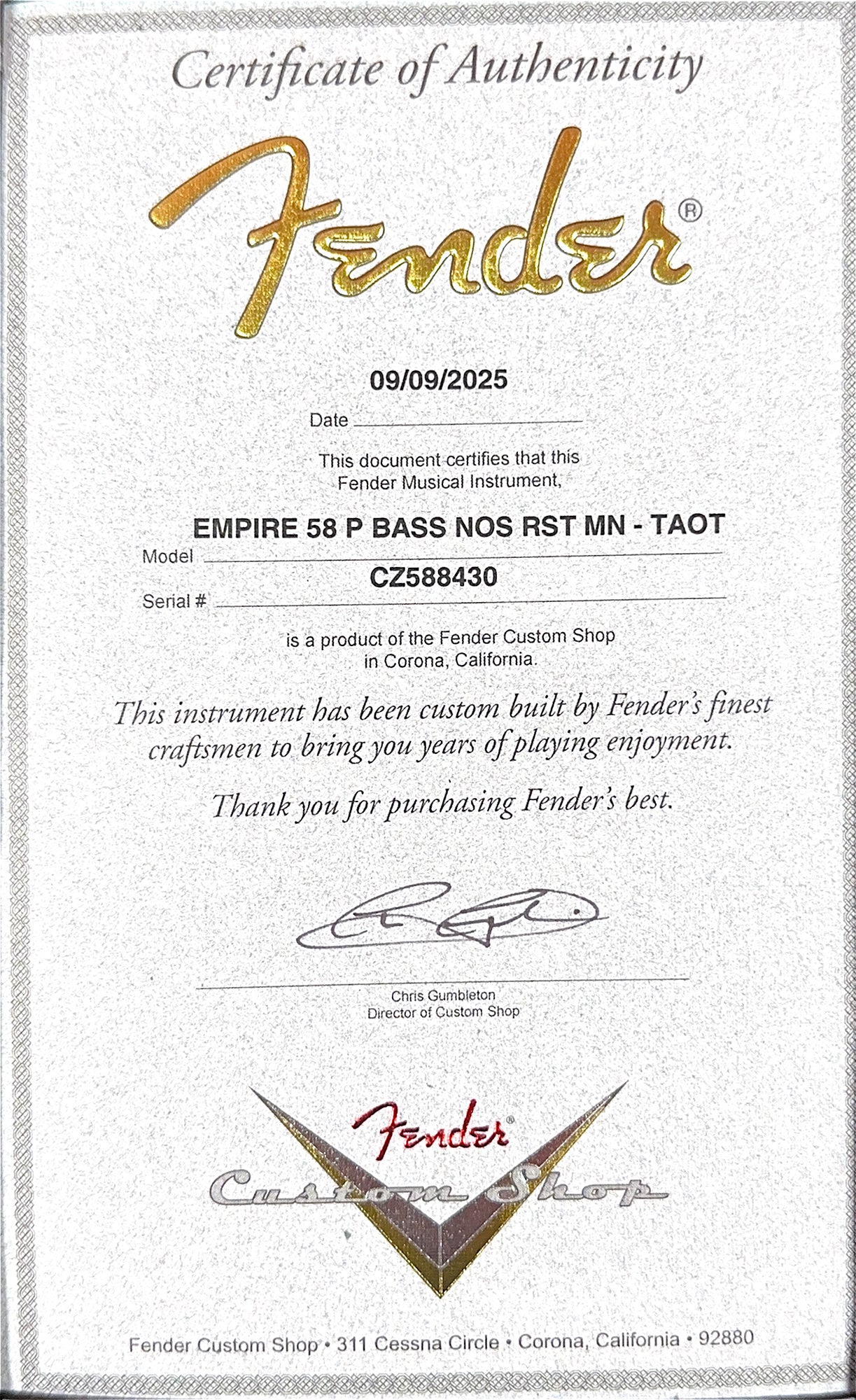 Our Custom Shop Authorized technicians complete a full professional factory-spec setup and inspection before shipping or in-store pickup, ensuring an extraordinary playing experience!