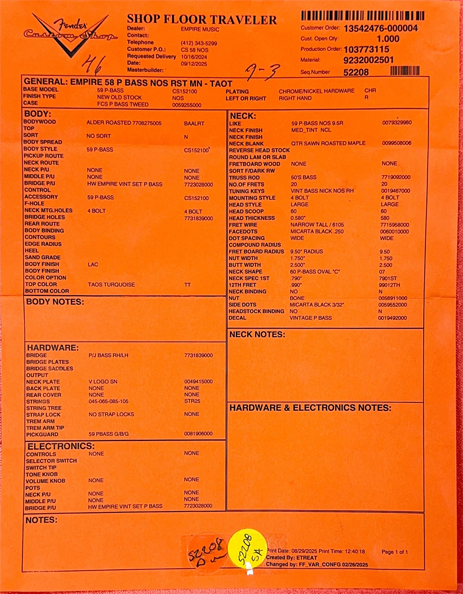 Fender Custom Shop Empire '58 Precision Bass NOS, Roasted Maple Neck, Taos Turquoise