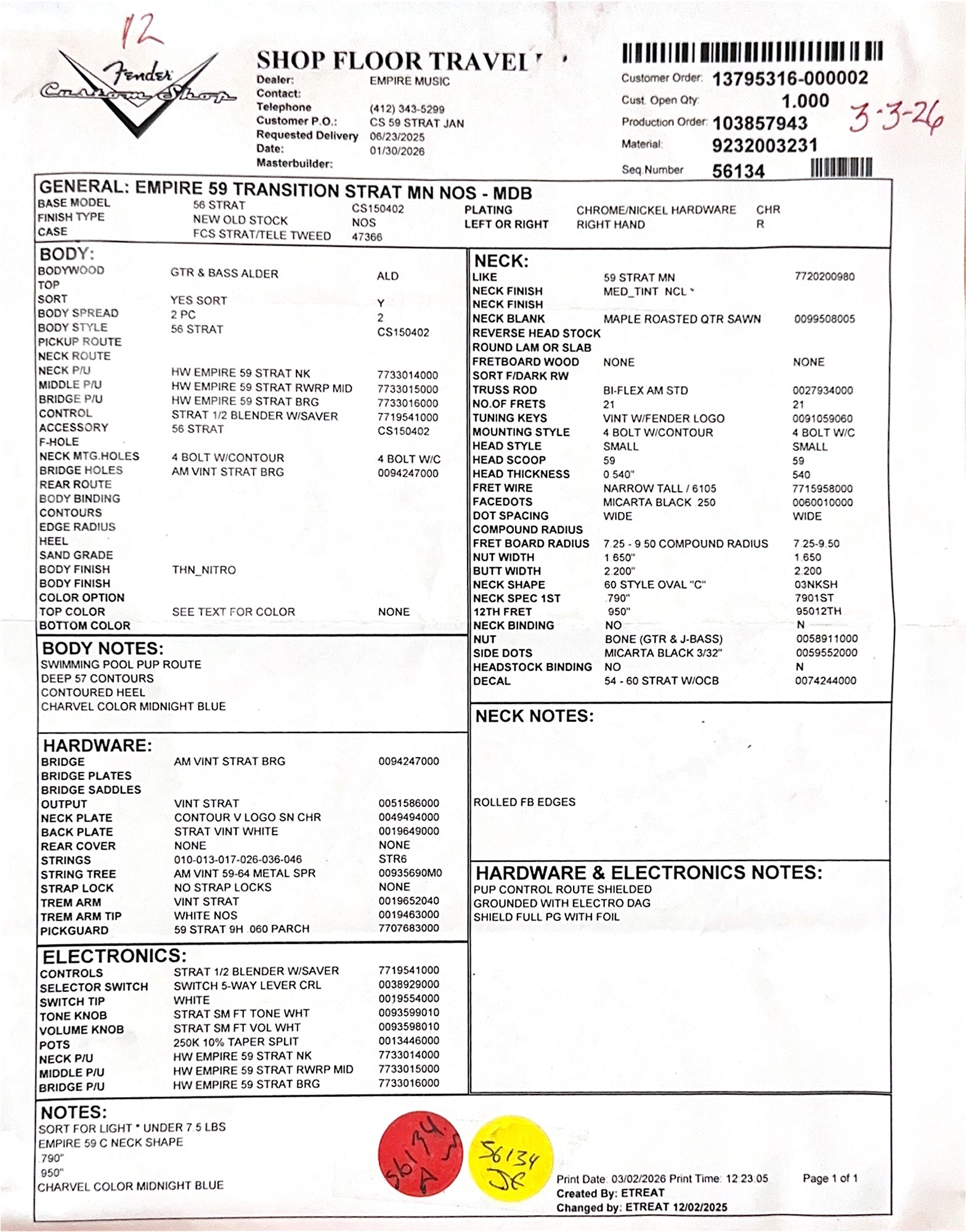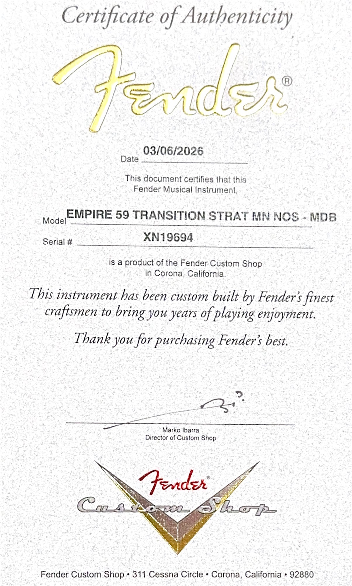 “For over 25 years, the Strat has been my go-to. The look, sound, and versatility of the Stratocaster, and the iconic heroes who play them, has been at the foundation of my experience as a musician. The Empire ‘59 Transition Strat draws on everything I love about the most expressive guitars ever made. Players will appreciate the familiar played-in neck and body feel, and the maturity and sweetness of our hand wound ‘59 pickups. These Strats are among the best I’ve played, and are a tribute to the deep connection between the Fender Stratocaster and the musicians who play them” - Justin, Empire Music