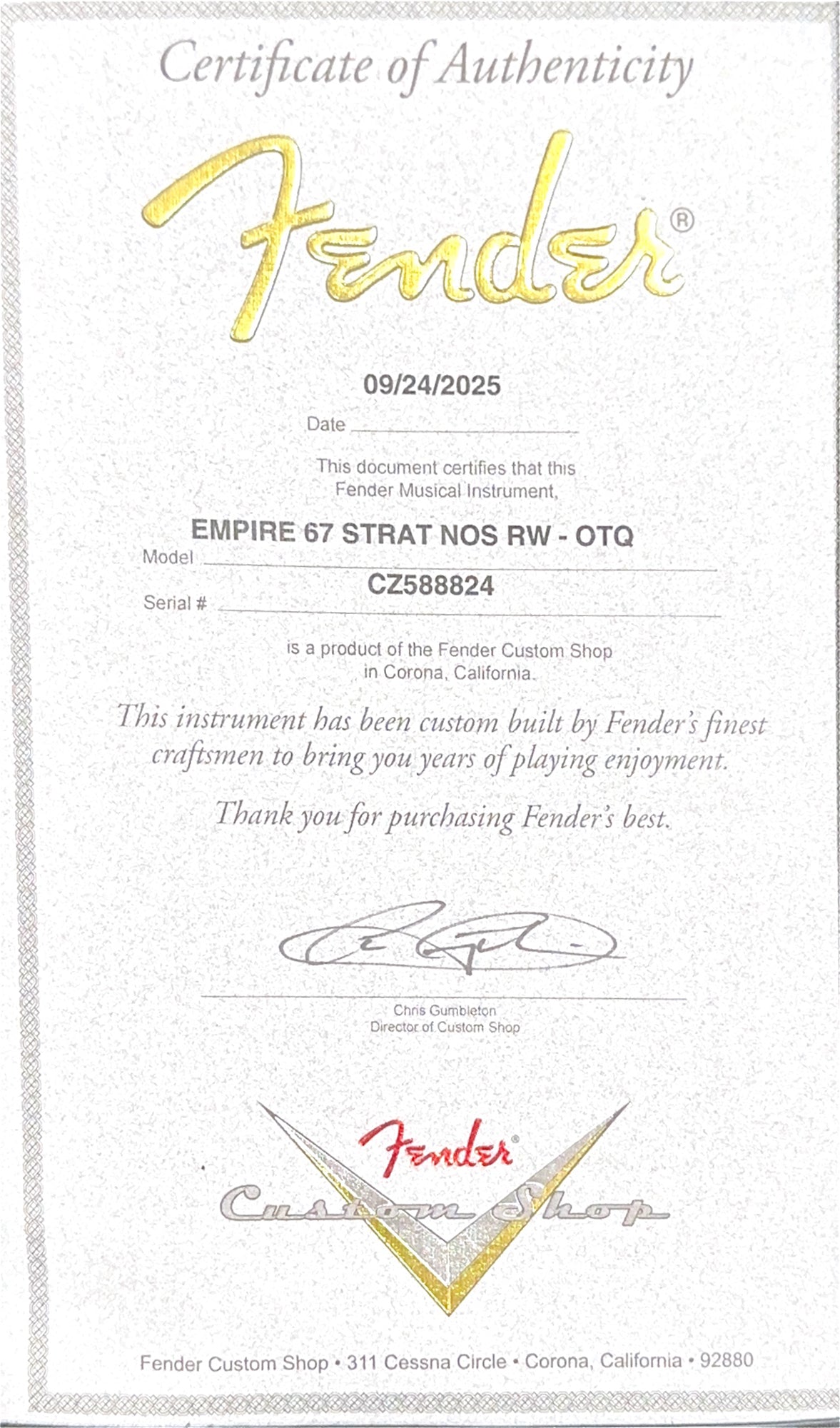 Our Custom Shop Authorized technicians complete a full professional factory-spec setup and inspection before shipping or in-store pickup, ensuring an extraordinary playing experience!