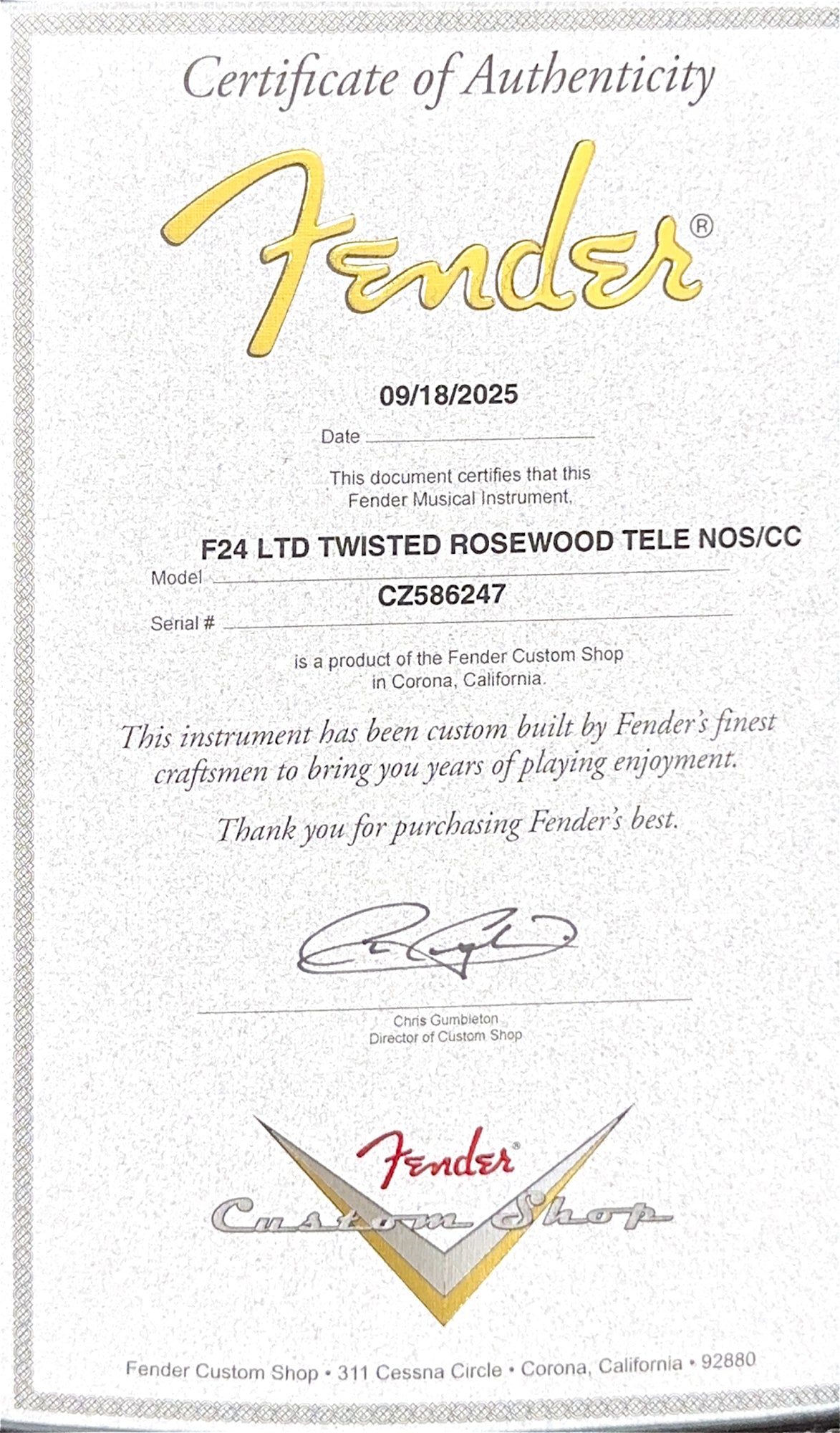 Our Custom Shop Authorized technicians complete a full professional factory-spec setup and inspection before shipping or in-store pickup, ensuring an extraordinary playing experience!