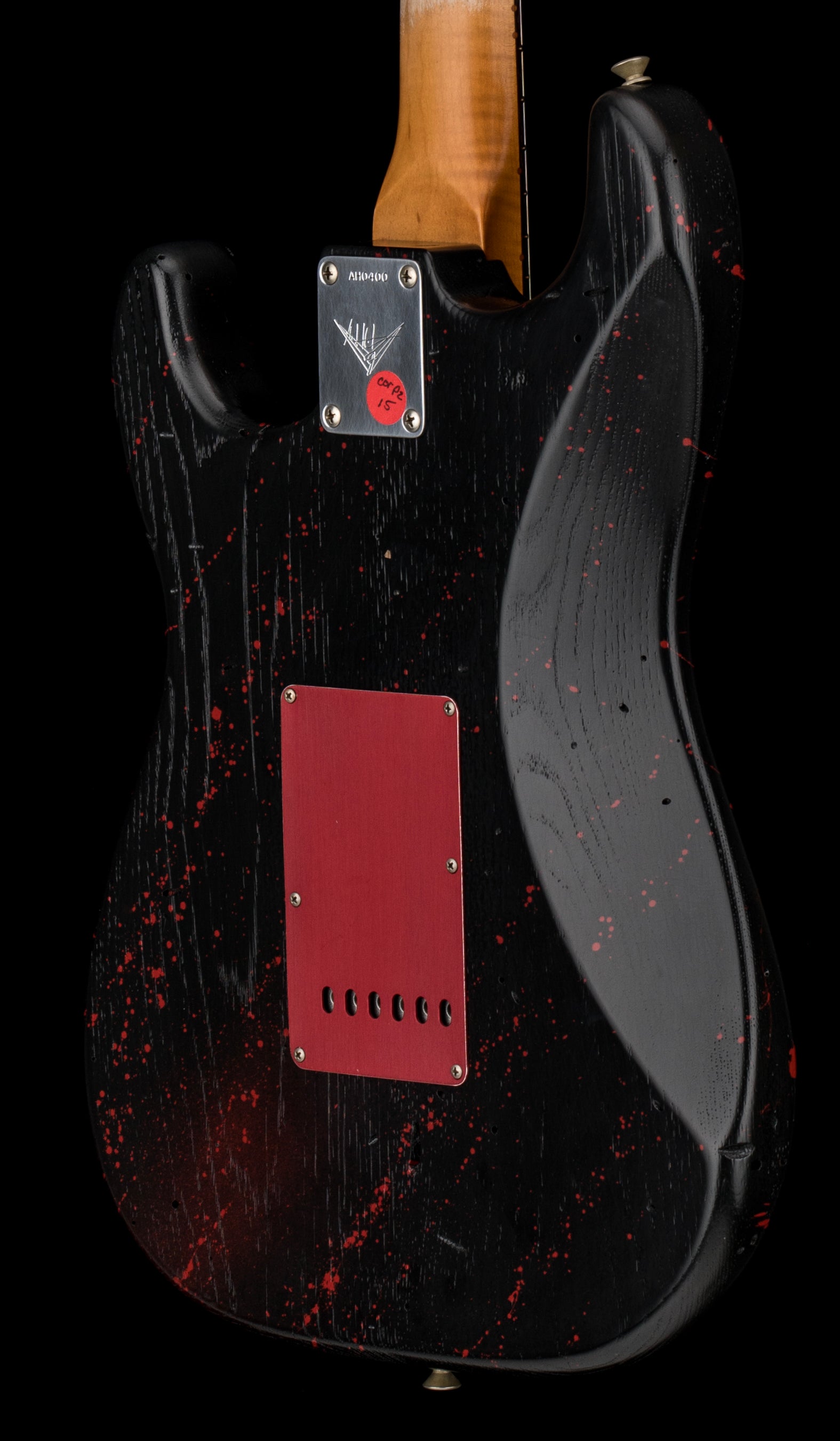Built by Fender Custom Shop Masterbuilder Andy Hicks' "The Haunted Strat" features a custom skull artwork with a black and red blood splatter pattern Journeyman Relic finish over a reclaimed American Chestnut body. The neck is made from AAA flame maple with a 60s Style Oval "C" shape, AAA rosewood fingerboard with a 9.5" radius, a bone nut, and 21 Narrow Tall frets. The hardware consists of an American Vintage Strat bridge, vintage-style tuning machines, an American Vintage 59-64 metal spacer string tree, and a red anodized pickguard and back plate. The electronics feature Custom Shop Hand Wound Josefina 62/63 Strat pickups and modern wiring with a 5-way switch. It comes with a deluxe hardshell case.