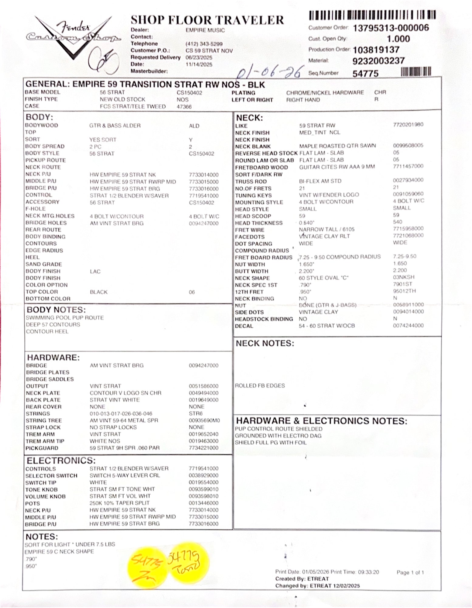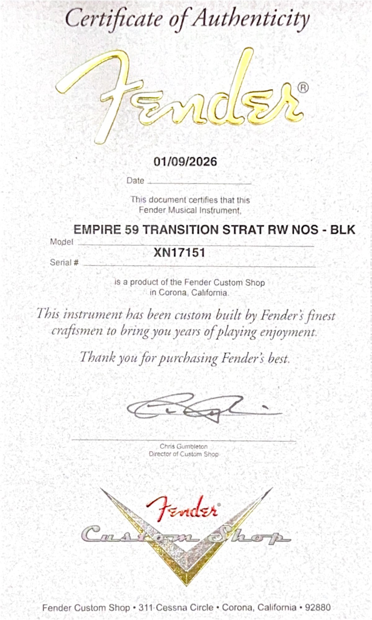 Fender Custom Shop Empire 59 Transition Stratocaster NOS, AAA Rosewood Fingerboard, Black