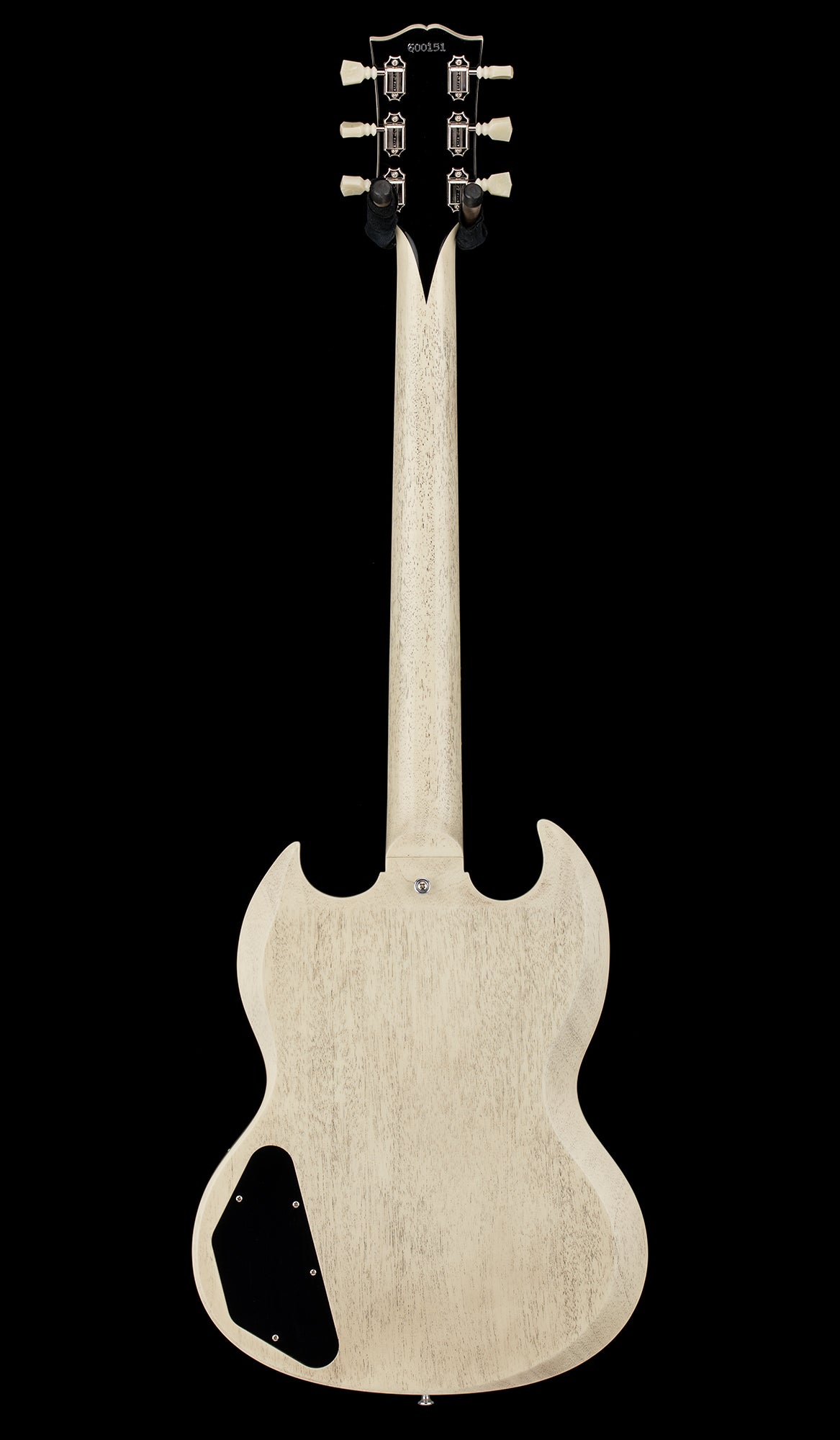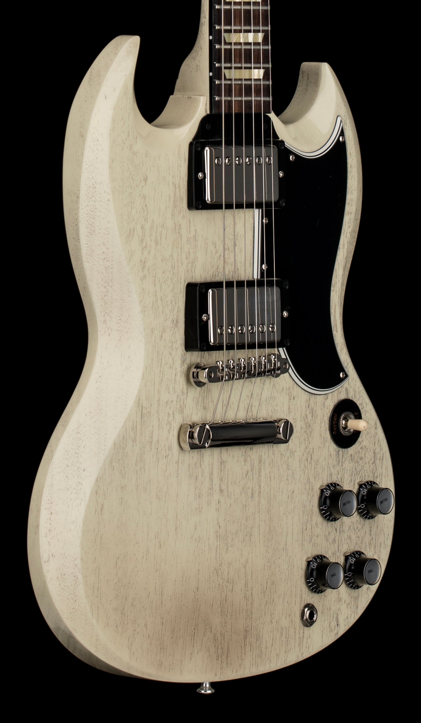 This unique SG Custom features a gloss TV White finish over it's mahogany body and neck. The neck is a 1961 Authentic Thin D-Shape profile, black neck binding, a rosewood fingerboard, Jescar medium jumbo frets, white side dots, aged cellulose trapezoid inlays, and nylon reissue nut. Rounding out the instrument is nickel hardware, Kluson Deluxe SD90SLN-DRSL tuners, ABR-1 Historic Reissue bridge and stop bar, 61 SG Standard True Historic black pickguard, and black top hat knobs with silver inserts. The pickups are Aged Rhythm Custom Buckers.