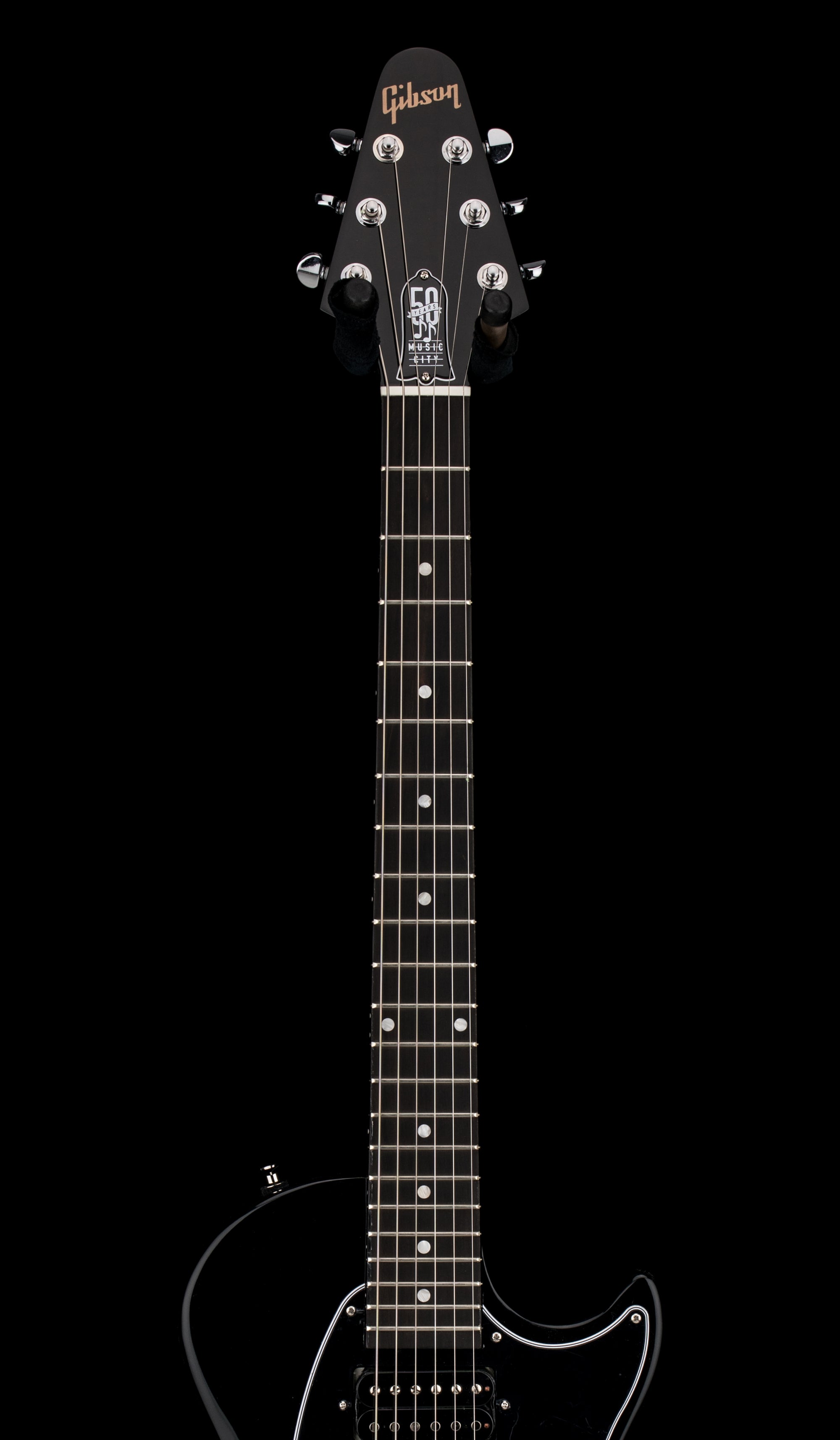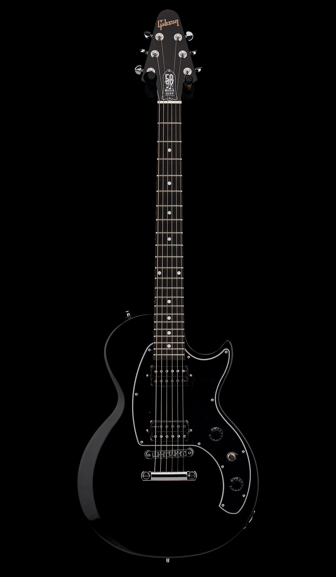 The Les Paul™ Music City Special – 50th Anniversary is an updated, modern twist on two historical Gibson models, taking much of its inspiration from the 70s-era Marauder with a touch of the Music City Junior in its DNA. Over the years, the Marauder has been used by artists from Adam Jones to Paul Stanley. This unique commemorative model pays tribute to the early days of Gibson’s Nashville production and celebrates Gibson’s 50 years of producing world-class guitars in Music City while delivering outstanding value to modern players. The lightweight, contoured body is solid poplar. The maple neck has a fast-playing and comfortable SlimTaper™ profile and is equipped with a striped ebony fretboard that is adorned with acrylic dot inlays and outfitted with 22 medium jumbo frets. The 12” fretboard radius makes first-position chords and string bends higher up the fretboard equally effortless. The hardware is chrome-plated, including the Nashville Tune-O-Matic™ bridge, aluminum Stop Bar tailpiece Grover® Mini Rotomatic® tuners, and output jack plate cover. A black 5-ply pickguard holds two Gibson 70s Tribute humbucker™ pickups, which are wired to an intuitive and comfortable control layout consisting of master volume and master tone controls with black Top Hat knobs and a three-way pickup selector toggle switch. A premium soft shell case is included to keep the Les Paul Music City Special - 50th Anniversary safe when stored or in transport. The Les Paul Music City Special - 50th Anniversary is available in Ebony, Wine Red, and Tobacco Burst gloss nitrocellulose lacquer finishes, and each has a commemorative 50th Anniversary truss rod cover. The Les Paul Music City Special - 50th Anniversary model is limited to only 650 instruments in each of the three colors, so make sure you get your favorite while you still can!