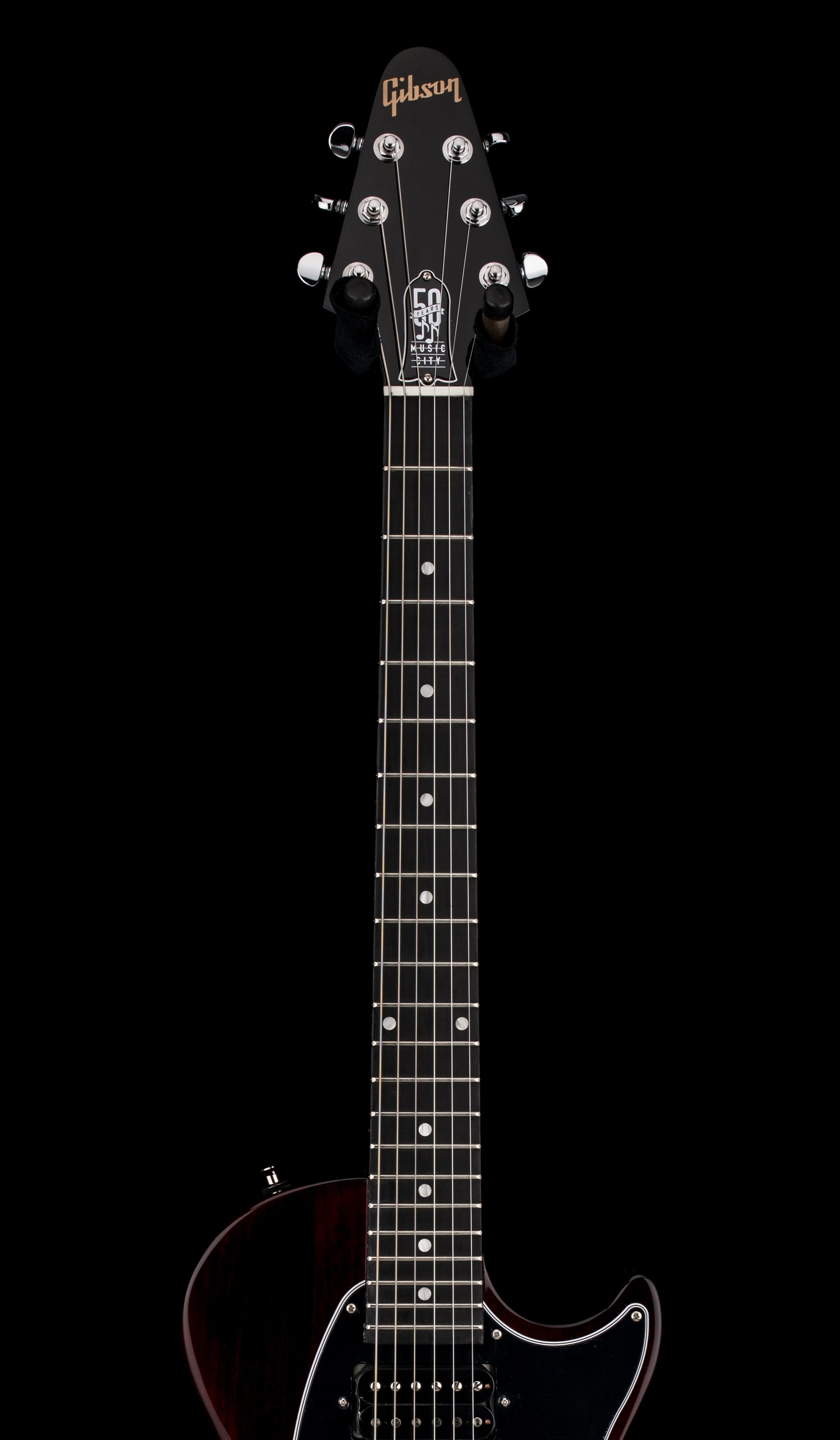 The Les Paul™ Music City Special – 50th Anniversary is an updated, modern twist on two historical Gibson models, taking much of its inspiration from the 70s-era Marauder with a touch of the Music City Junior in its DNA. Over the years, the Marauder has been used by artists from Adam Jones to Paul Stanley. This unique commemorative model pays tribute to the early days of Gibson’s Nashville production and celebrates Gibson’s 50 years of producing world-class guitars in Music City while delivering outstanding value to modern players. The lightweight, contoured body is solid poplar. The maple neck has a fast-playing and comfortable SlimTaper™ profile and is equipped with a striped ebony fretboard that is adorned with acrylic dot inlays and outfitted with 22 medium jumbo frets. The 12” fretboard radius makes first-position chords and string bends higher up the fretboard equally effortless. The hardware is chrome-plated, including the Nashville Tune-O-Matic™ bridge, aluminum Stop Bar tailpiece Grover® Mini Rotomatic® tuners, and output jack plate cover. A black 5-ply pickguard holds two Gibson 70s Tribute humbucker™ pickups, which are wired to an intuitive and comfortable control layout consisting of master volume and master tone controls with black Top Hat knobs and a three-way pickup selector toggle switch. A premium soft shell case is included to keep the Les Paul Music City Special - 50th Anniversary safe when stored or in transport. The Les Paul Music City Special - 50th Anniversary is available in Ebony, Wine Red, and Tobacco Burst gloss nitrocellulose lacquer finishes, and each has a commemorative 50th Anniversary truss rod cover. The Les Paul Music City Special - 50th Anniversary model is limited to only 650 instruments in each of the three colors, so make sure you get your favorite while you still can!