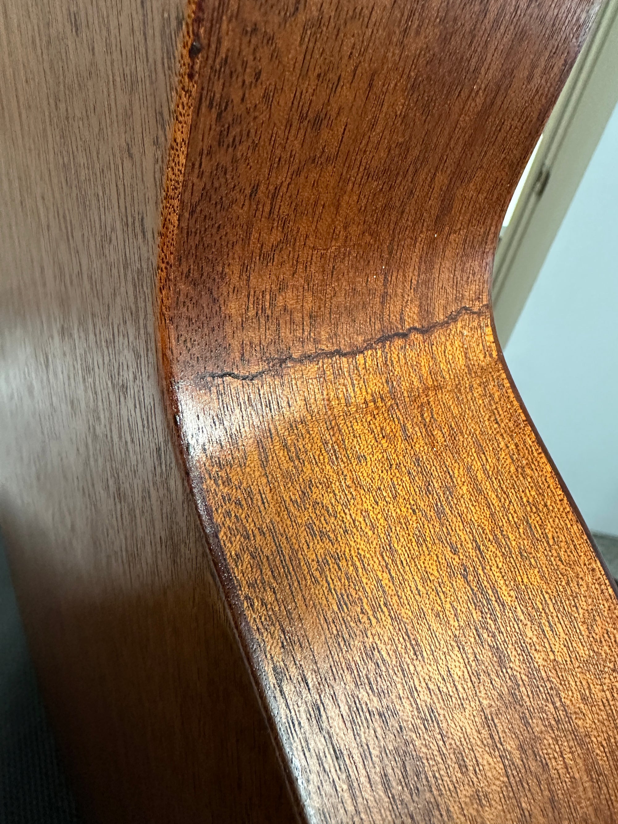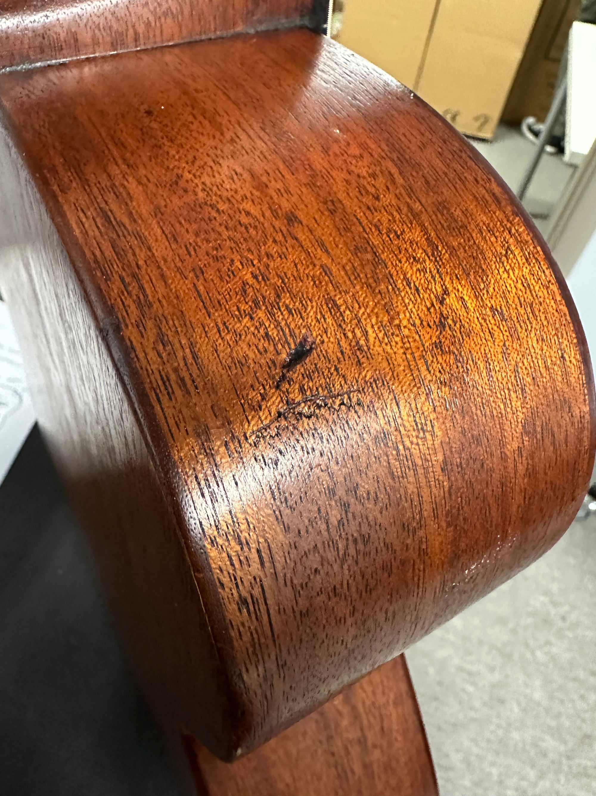 Note: After close inspection, this instrument has general scratching, chipping, scuffs, and impressions throughout, and a large chip in the upper back low E string side. There have been professional repairs to: body cracks on both sides, bridge has been reglued, and the nut, bridge saddle, and bridge pins have been replaced. (See pics)