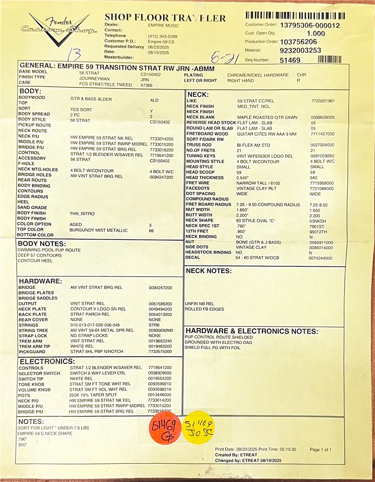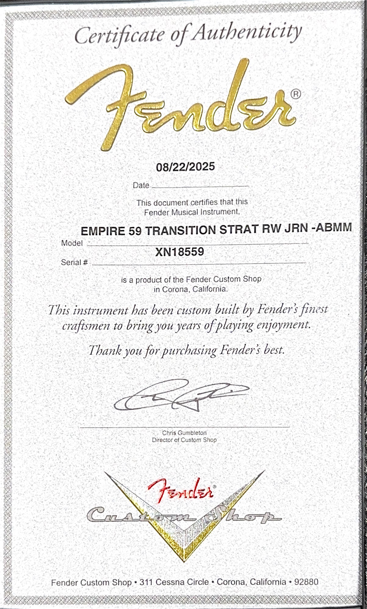 “For over 25 years, the Strat has been my go-to. The look, sound, and versatility of the Stratocaster, and the iconic heroes who play them, has been at the foundation of my experience as a musician. The Empire ‘59 Transition Strat draws on everything I love about the most expressive guitars ever made. Players will appreciate the familiar played-in neck and body feel, and the maturity and sweetness of our hand wound ‘59 pickups. These Strats are among the best I’ve played, and are a tribute to the deep connection between the Fender Stratocaster and the musicians who play them” - Justin, Empire Music