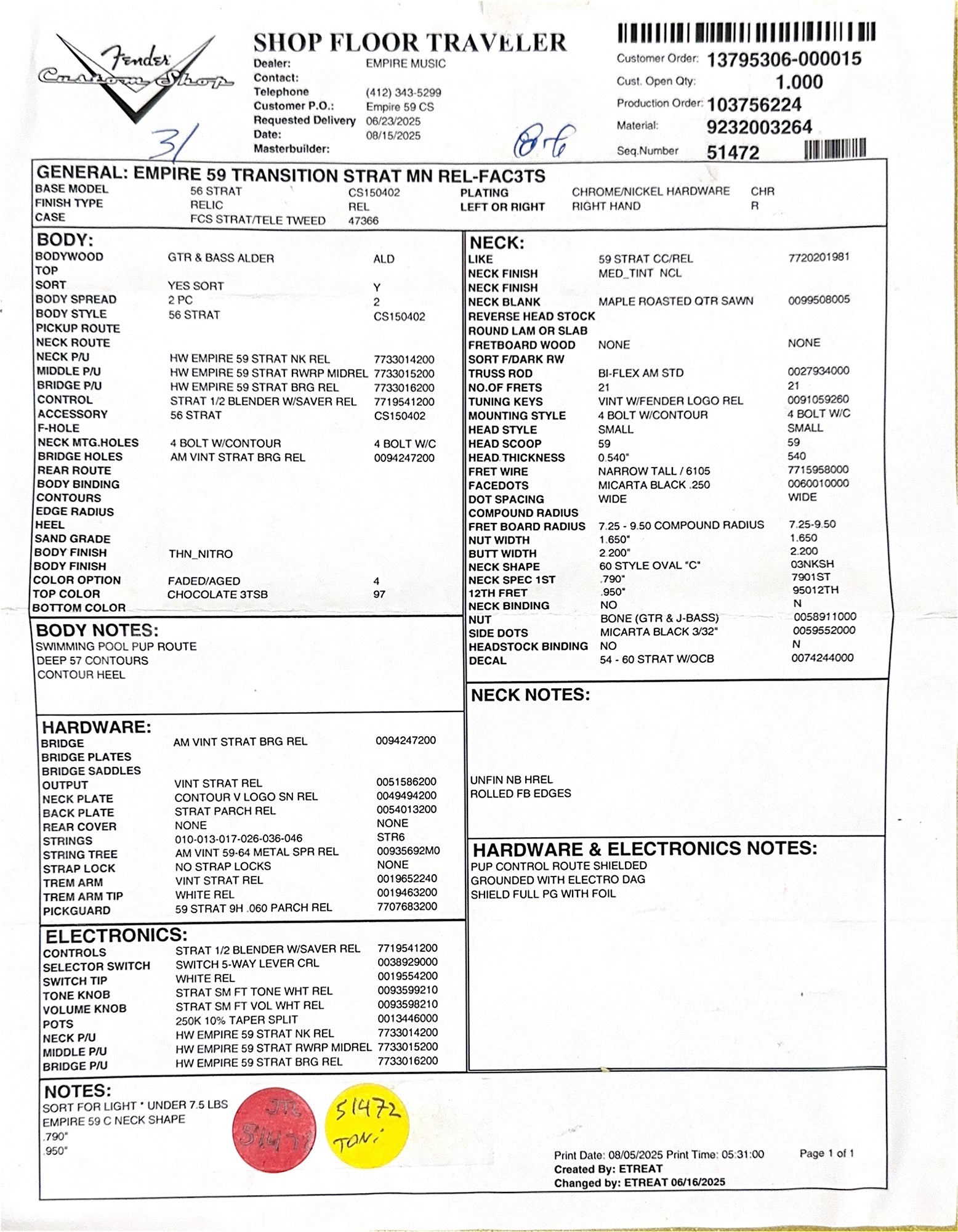 Fender Custom Shop Empire 59 Transition Stratocaster Relic, Roasted Maple Neck/Fingerboard, Faded Aged Chocolate 3-Tone Sunburst