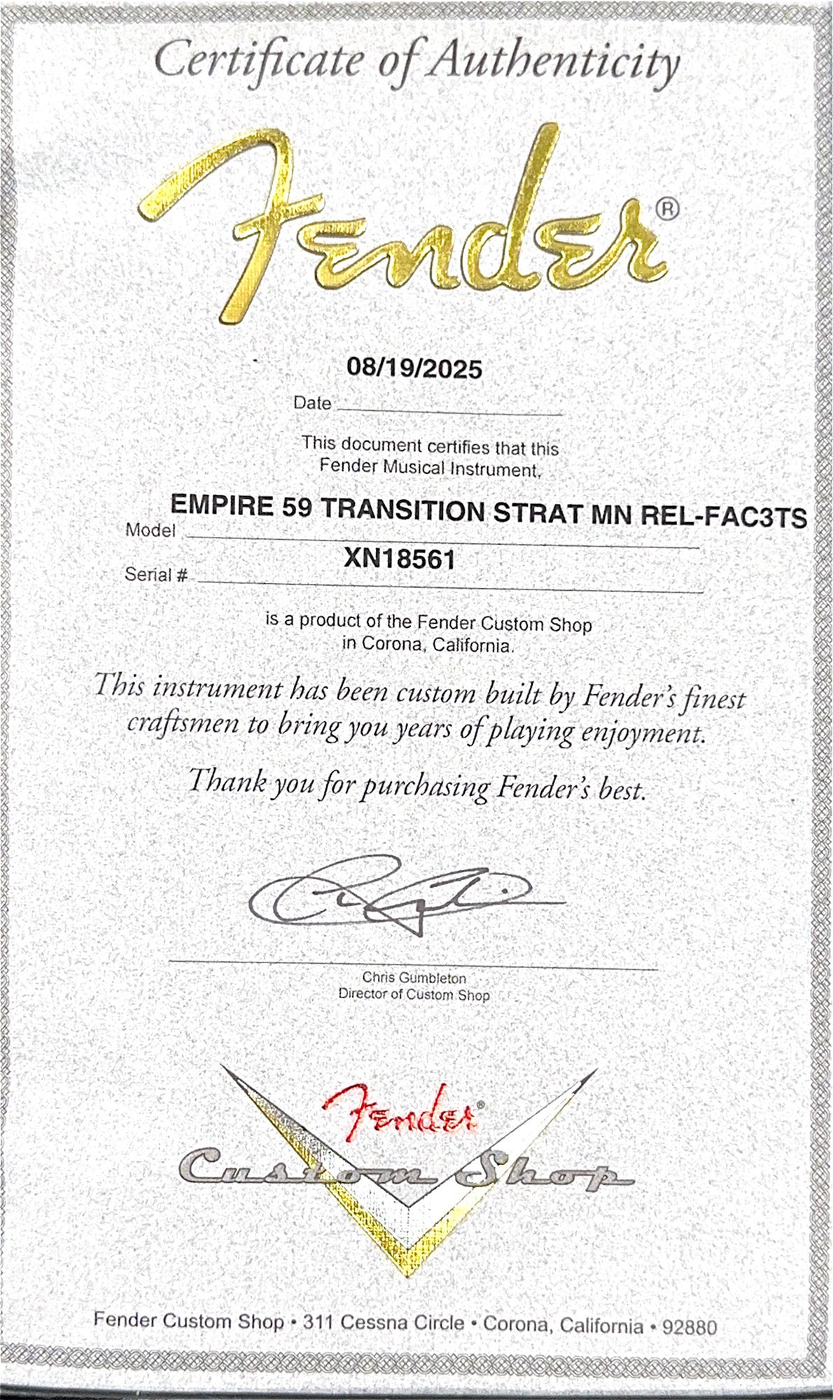 “For over 25 years, the Strat has been my go-to. The look, sound, and versatility of the Stratocaster, and the iconic heroes who play them, has been at the foundation of my experience as a musician. The Empire ‘59 Transition Strat draws on everything I love about the most expressive guitars ever made. Players will appreciate the familiar played-in neck and body feel, and the maturity and sweetness of our hand wound ‘59 pickups. These Strats are among the best I’ve played, and are a tribute to the deep connection between the Fender Stratocaster and the musicians who play them” - Justin, Empire Music