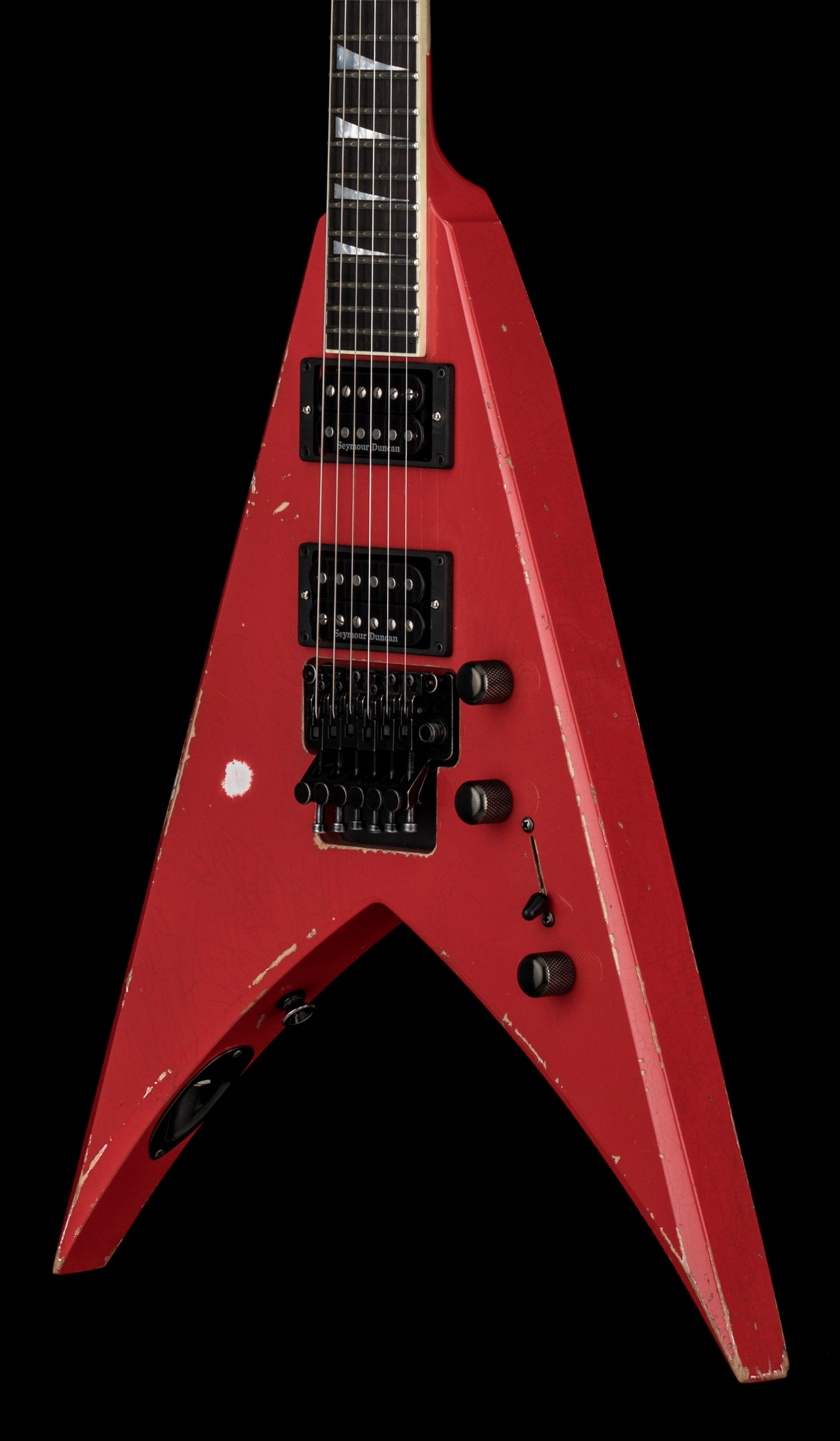 A ripper, a show stopper, or a masterpiece? This guitar is all of the above. Part of The Music Zoo's Nitro Aged series, this King V from the Jackson Custom Shop boasts a unique Fiesta Red finish, neck through construction, Seymour Duncan humbuckers, and a recessed Floyd. This guitar is pure Jackson and pure shred, and we love it! The thin finish helps the guitar resonate, and the maple neck with compound radius fingerboard provides effortless playability!