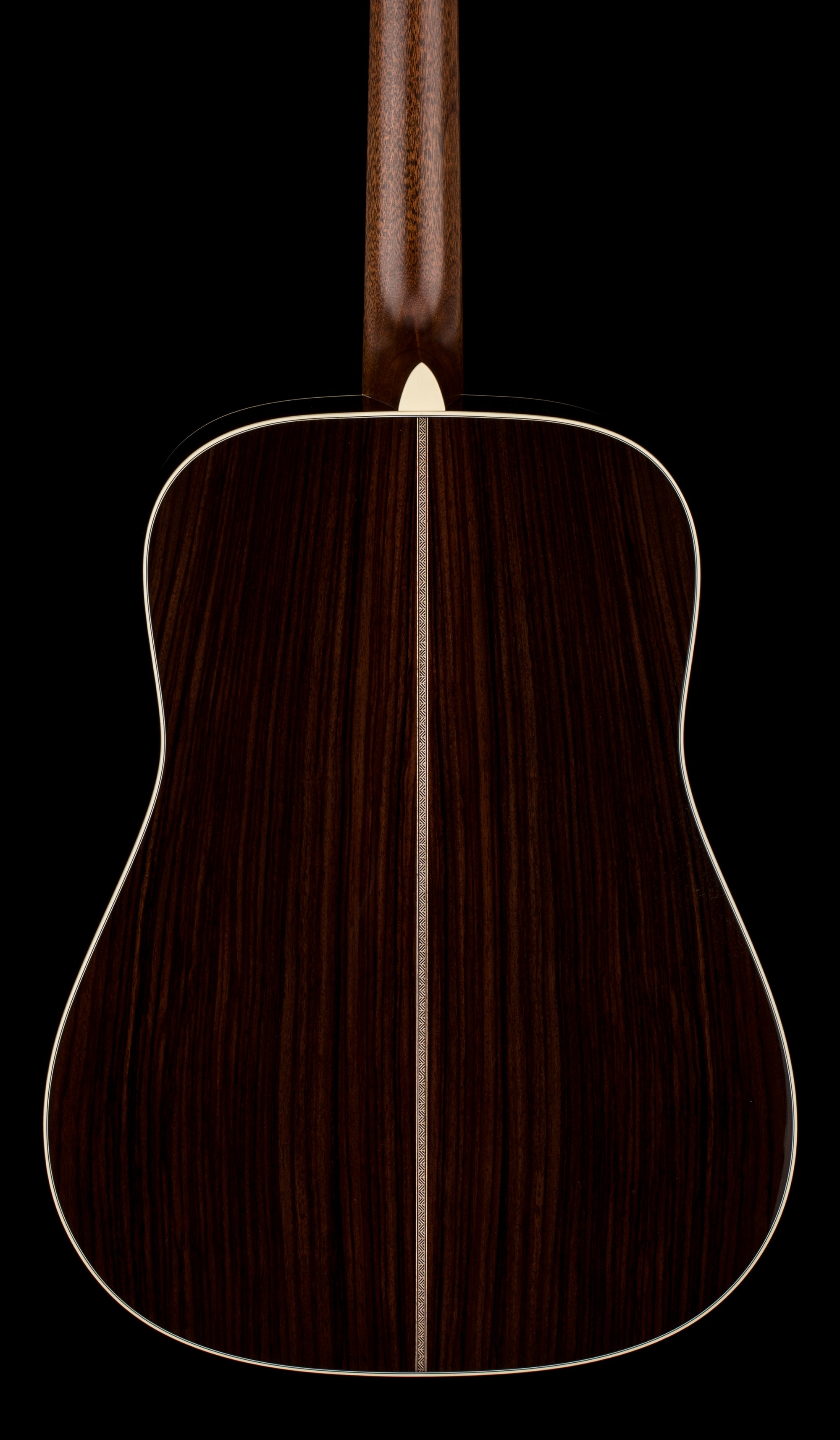 Inspired by Billy Strings' prized 1940 D-28, the Martin D-28 Billy Strings brings a modern twist to a classic pre-war design, incorporating features tailored to Billy's electrifying playing style. This signature Dreadnought showcases a unique 25" scale length, reducing string tension for fast, intricate playing and expressive bends – perfectly suited for Billy’s rapid-fire licks. With a custom nut width that’s slightly wider than his pre-war Martin and a modified low oval satin neck, it offers enhanced comfort and speed, ideal for players who crave agility up and down the neck. The solid East Indian rosewood back and sides and spruce top deliver a full, resonant tone with rich bass, while the bold herringbone trim, antique toner, and antique white binding add vintage flair. Nickel enclosed gear tuners, exclusive to Martin, and an ebony fingerboard with abalone diamond and square inlay round out the guitar’s looks and performance. It’s an ideal balance of traditional craftsmanship and modern playability, much like Billy’s genre-defying style. Each guitar features a custom paper label with his pre-printed signature and graphic.