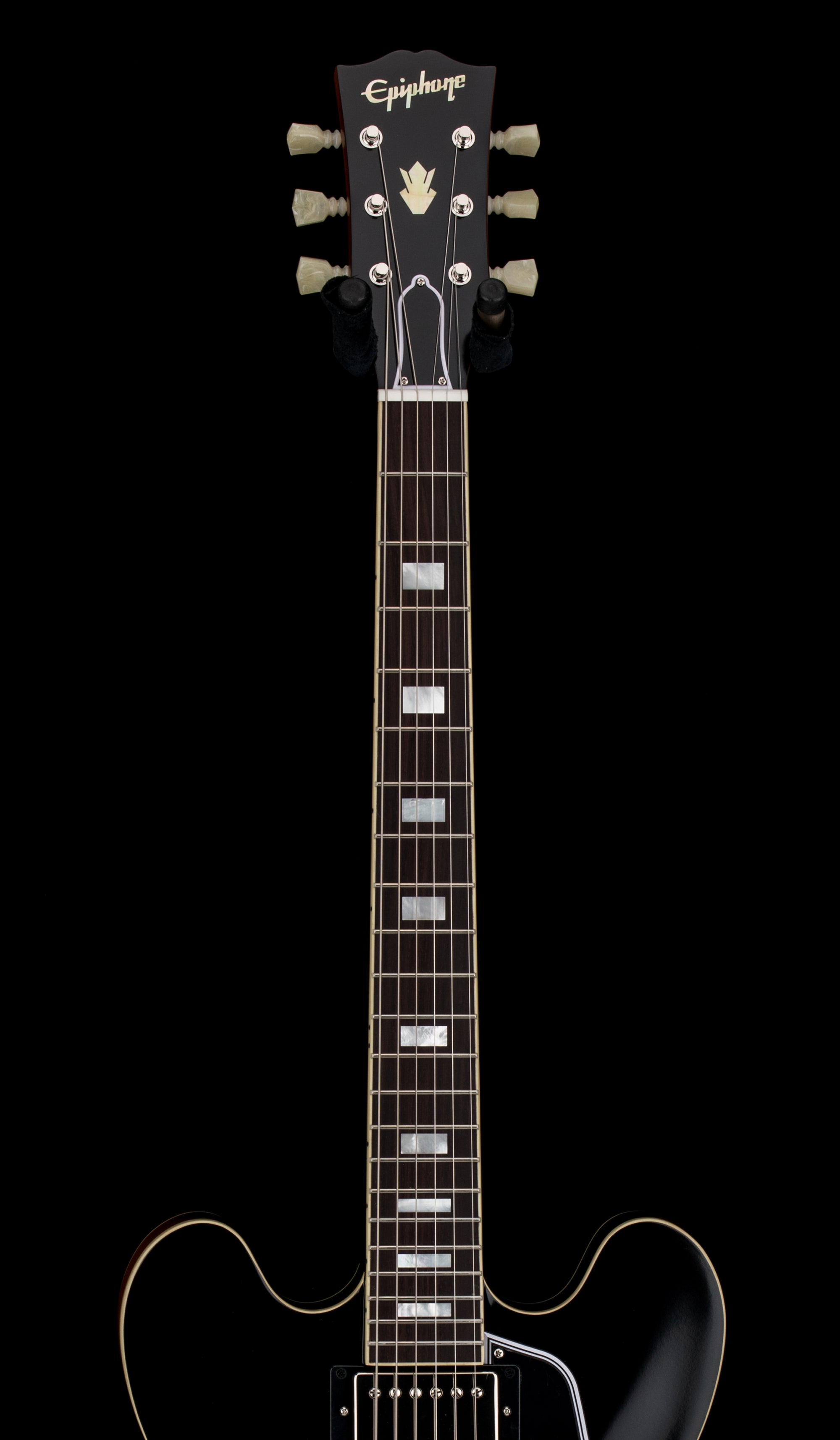 The Gibson-style “open book” headstock features the Epiphone logo and Gibson Crown inlaid in aged mother-of-pearl and is fitted with smooth-turning Epiphone Deluxe tuning machines with Double Ring Keystone-style buttons and a Graph Tech® nut. An ABR-1 Tune-O-Matic™ bridge and Gibson historic reissue aluminum Stop Bar tailpiece anchor the strings at the other end directly into the solid maple centerblock and further contribute to the 1962 ES-335’s excellent sustain.