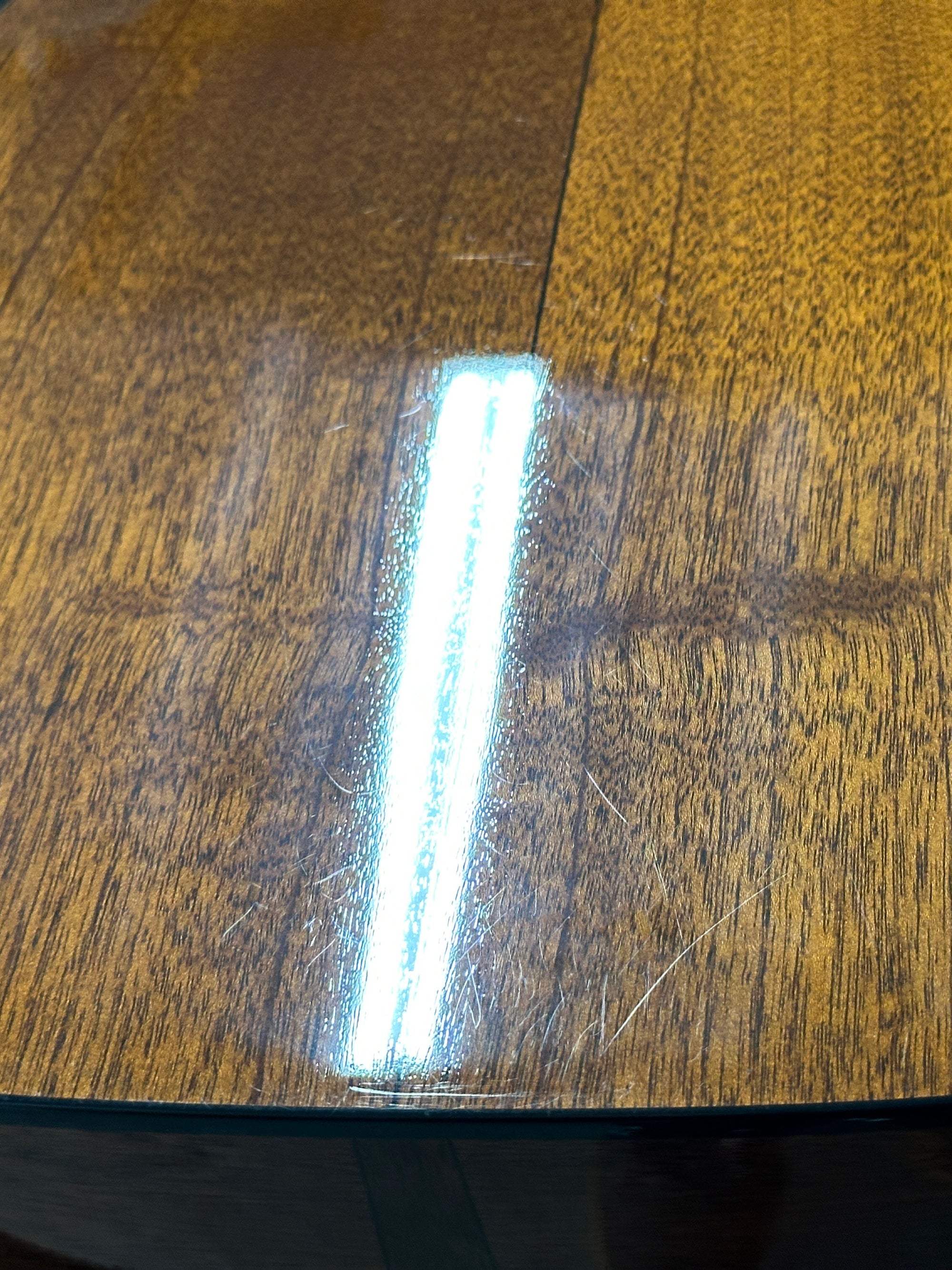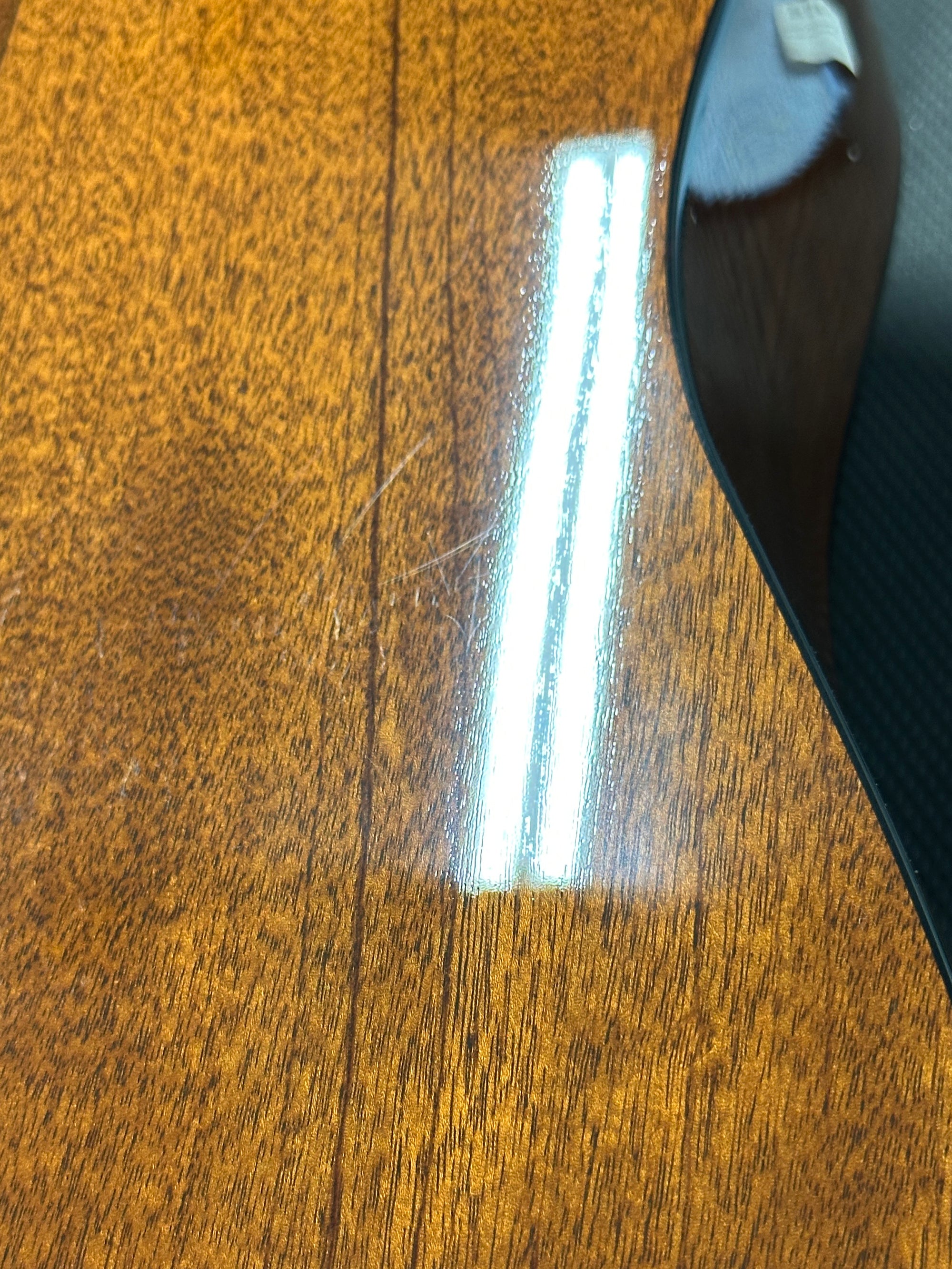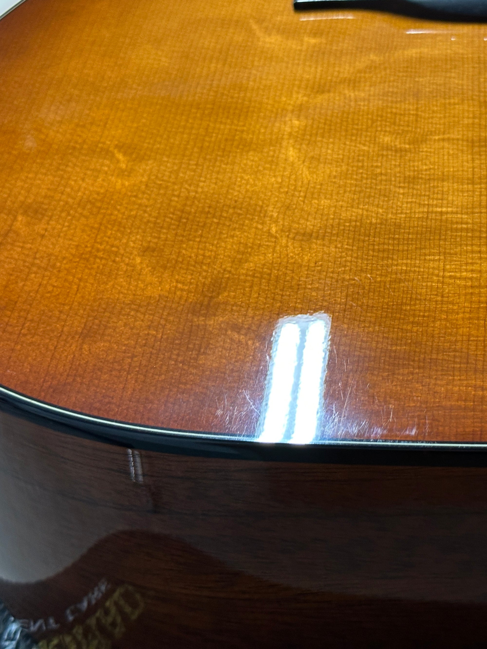 Note: After close inspection, this instrument has finish scratching, swirling, hazing, and light impressions on the back of the neck and high E string side lower bout. (See pics, light reflections used to show wear)