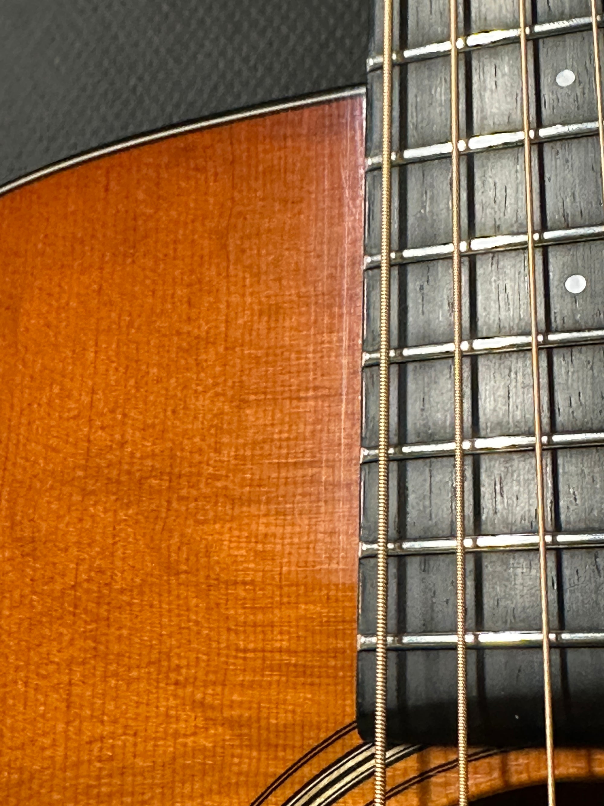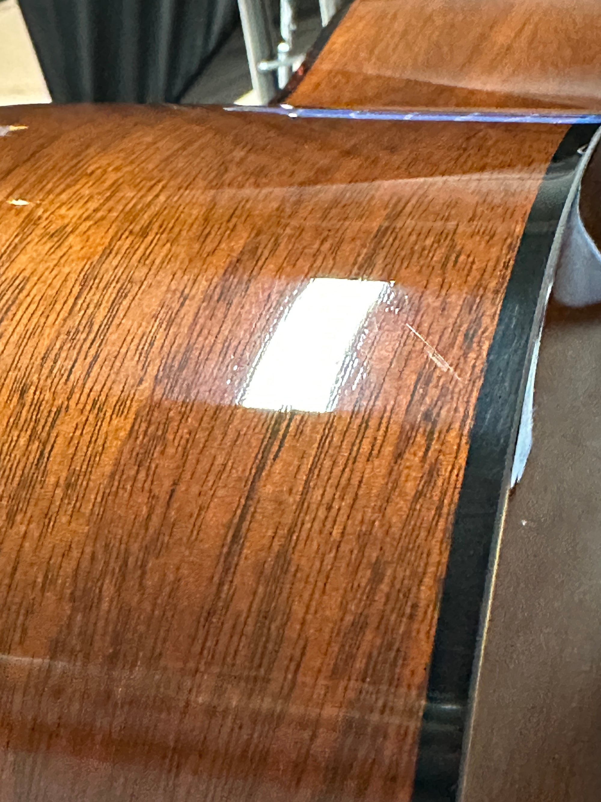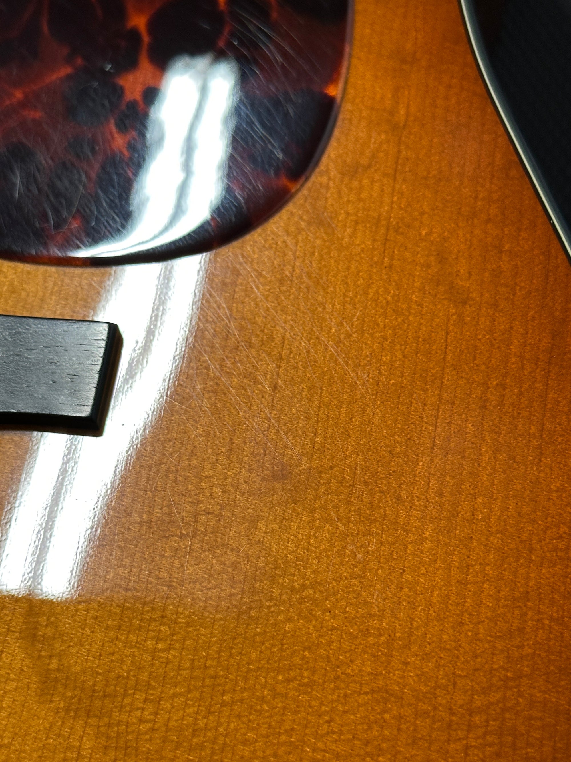Note: After close inspection, this instrument has finish scratching, swirling, hazing, and light impressions on the back of the neck and high E string side lower bout. (See pics, light reflections used to show wear)