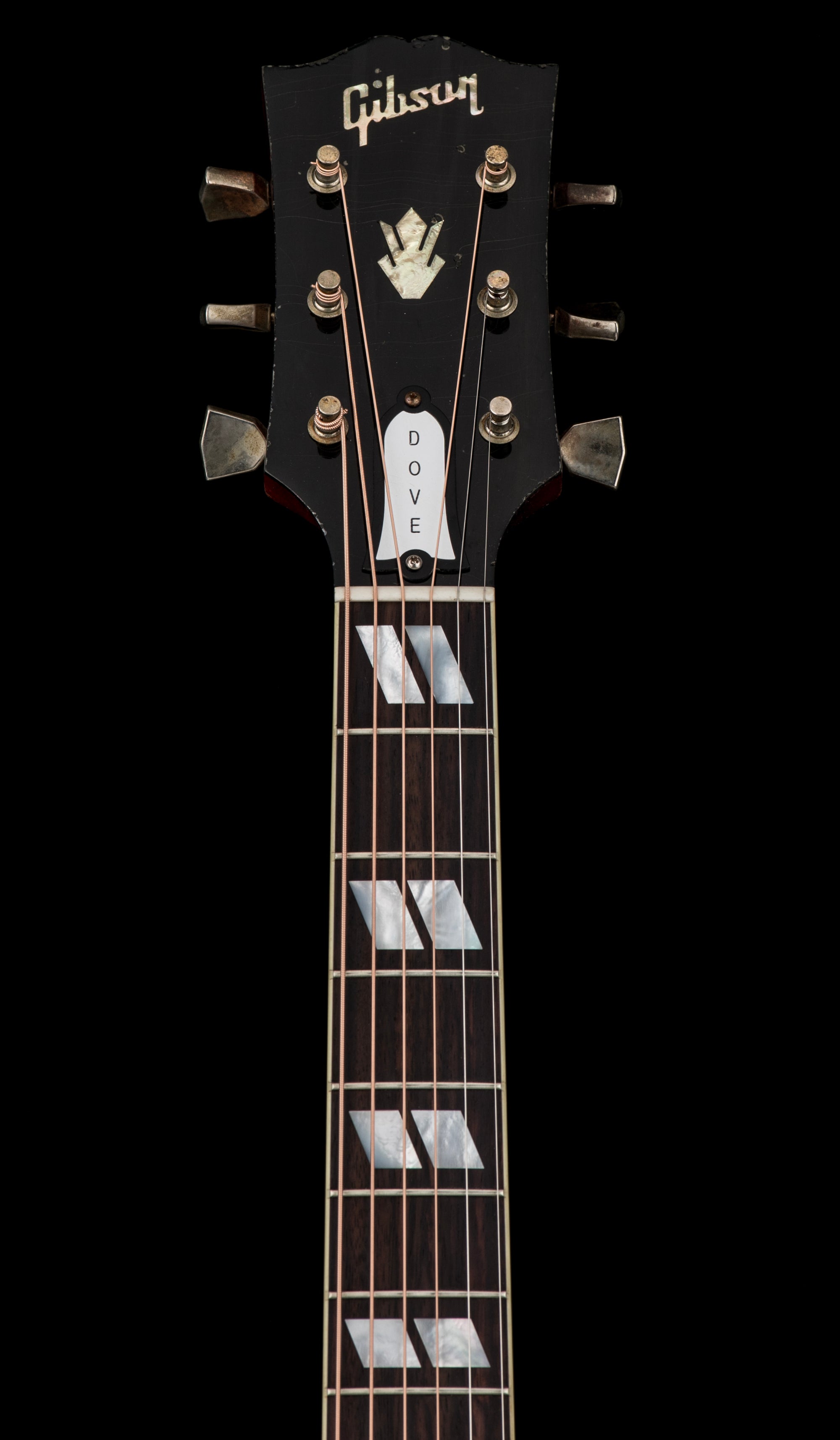 The Gibson Dove™ was first introduced to the world in 1962 at the dawn of one of the most revolutionary and impactful decades in popular music history. It was the second Gibson square shoulder acoustic model, following the Hummingbird™, which was first released two years earlier, in 1960. Over sixty years after its introduction, the Dove remains one of the world’s most popular, instantly recognizable, and iconic acoustic guitars. The Dove has been seen in the hands of some of the biggest names in music, including Tom Petty, Elvis, Alex Lifeson, John Mellencamp, and Frank Hannon, just to name a few. Now, Gibson Custom is very proud to introduce the 1963 Dove Light Aged, a faithful recreation of the early Dove models, masterfully aged by the artisans of the Murphy Lab to give it the look and feel of a well-loved vintage example. The 1963 Dove Light Aged has a thermally aged Sitka spruce top with traditional scalloped X-bracing to help give it the tone of a well-seasoned vintage guitar and beautifully flamed maple back and sides that are finished in Cherry. The mahogany neck has a comfortable Round profile and is topped with an Indian rosewood fretboard that is equipped with 20 standard frets and adorned with mother-of-pearl parallelogram inlays. The longer scale length of 25.5”, coupled with the maple body, gives the Dove a distinctive tone that is somewhat louder and a bit brighter and fuller than the Hummingbird’s more midrange-focused tone. The Dove’s headstock has the Gibson logo and crown inlays in mother-of-pearl and is equipped with high-quality nickel Kluson® Waffleback tuners and a black-bordered white truss rod cover with DOVE lettering. The nut is bone, as are the saddle and bridge pins. The saddle is fitted into an iconic Dove rosewood bridge plate that is fitted with two mother-of-pearl dove inlays. The instantly identifiable Dove pickguard is decorated with stamped vines and flowers and a mother-of-pearl dove. The 1963 Dove Light Aged features Light Aging by the skilled artisans of the Murphy Lab. The Murphy Lab Light Aged finish treatment, paired with lightly aged hardware, simulates decades of light play wear, giving it the unique character, vibe, and feel of an original example from the Gibson Golden Era. It comes packed in a vintage-style black hardshell case to complete an authentic vintage playing and ownership experience that only Gibson Custom and the Murphy Lab can provide.