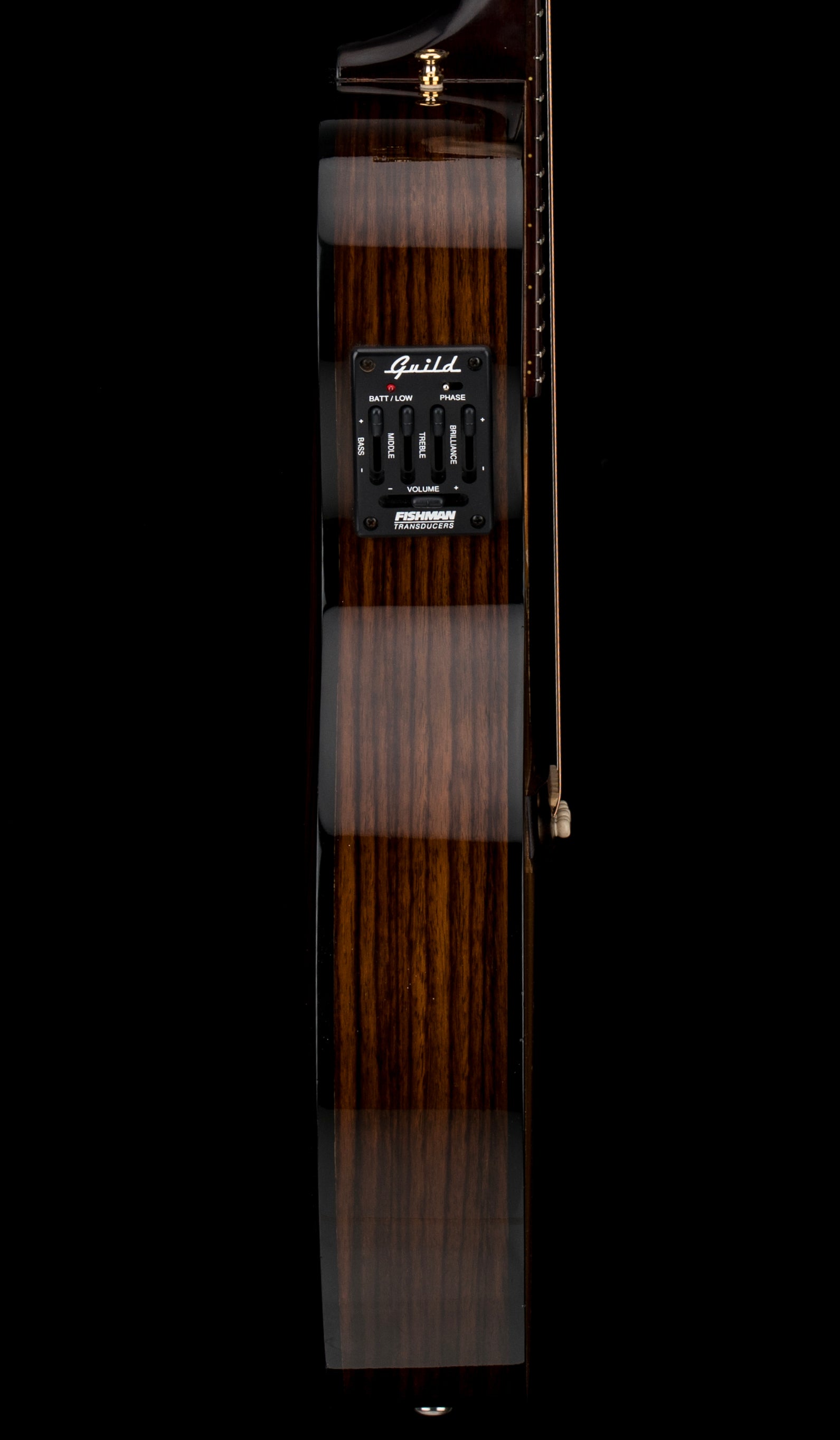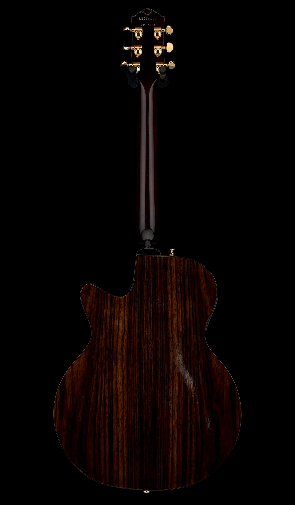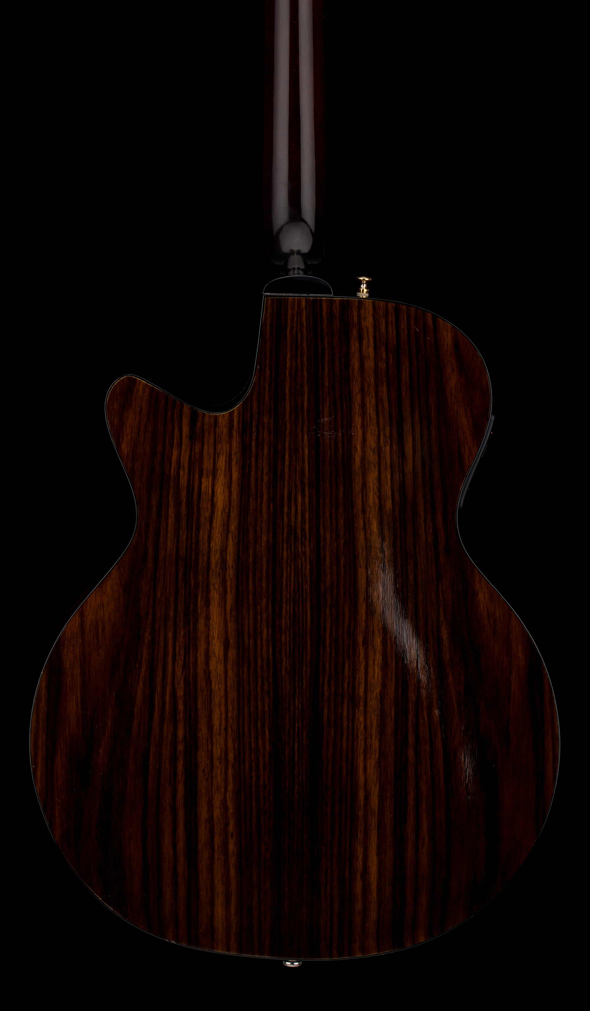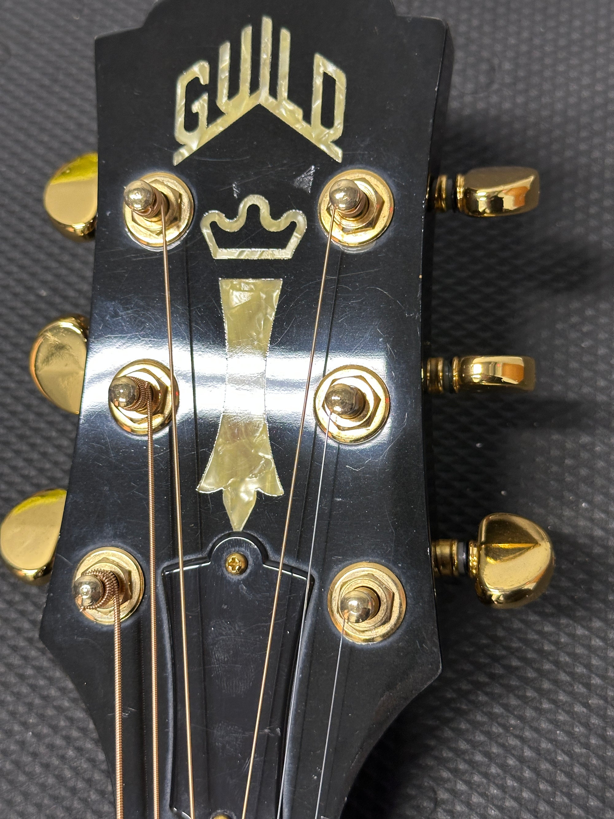 This early '90s Guild F5CE-NT was built in Westerly Rhode Island with premium appointments, and lead playing in mind. The guitar features an approximately 3" deep cutaway jumbo body, solid spruce X-braced top, solid rosewood arched back and sides, oval shaped sound hole, 24 fret rosewood fingerboard, 1-5/8" nut width, tortoiseshell pickguard, and a Guild/Fishman under-saddle bridge transducer and pre-amp.