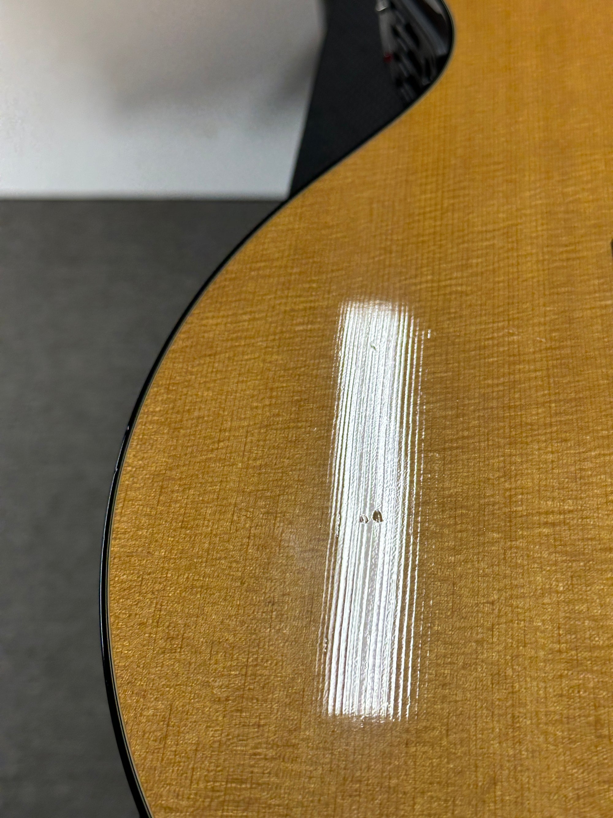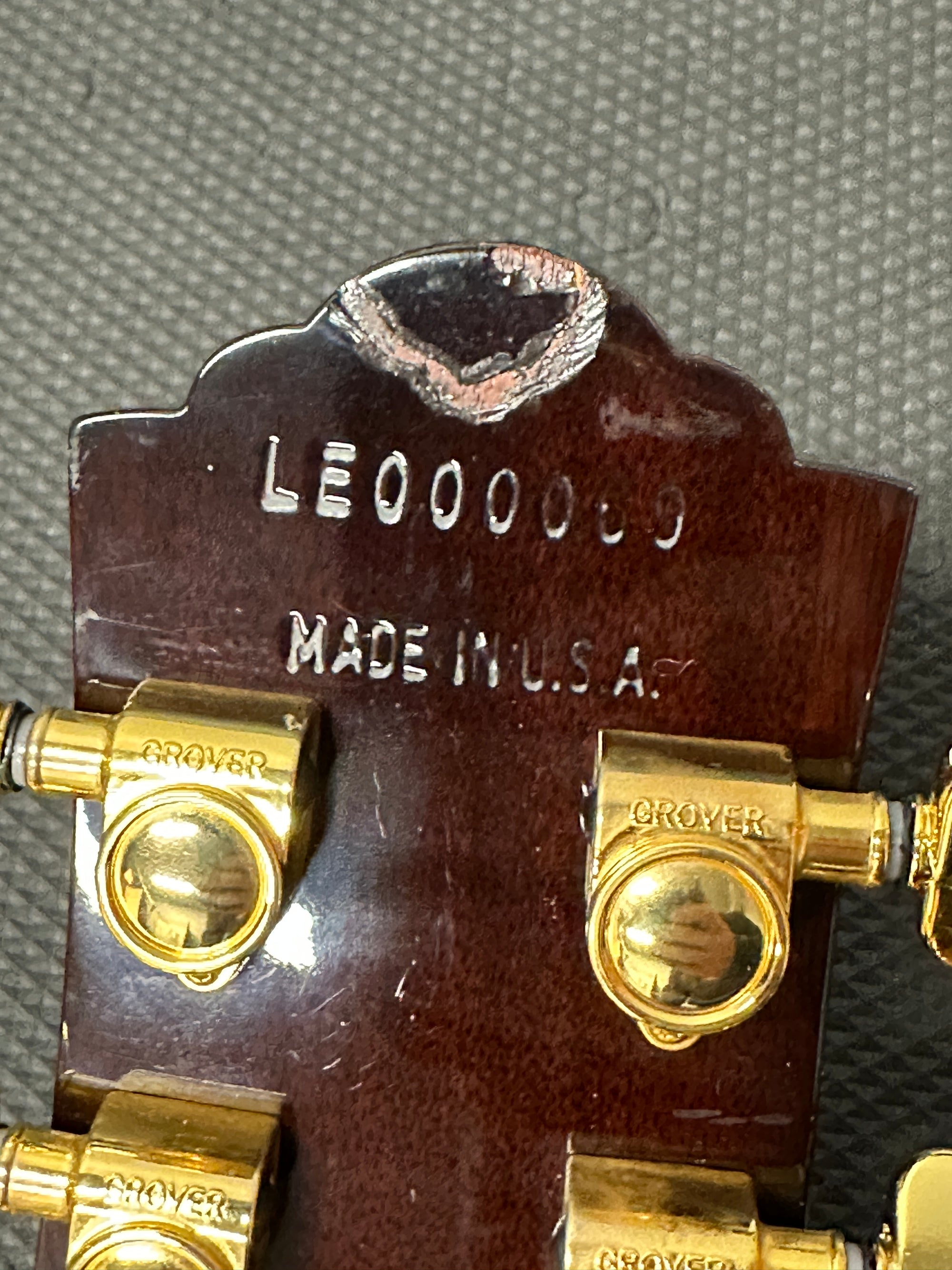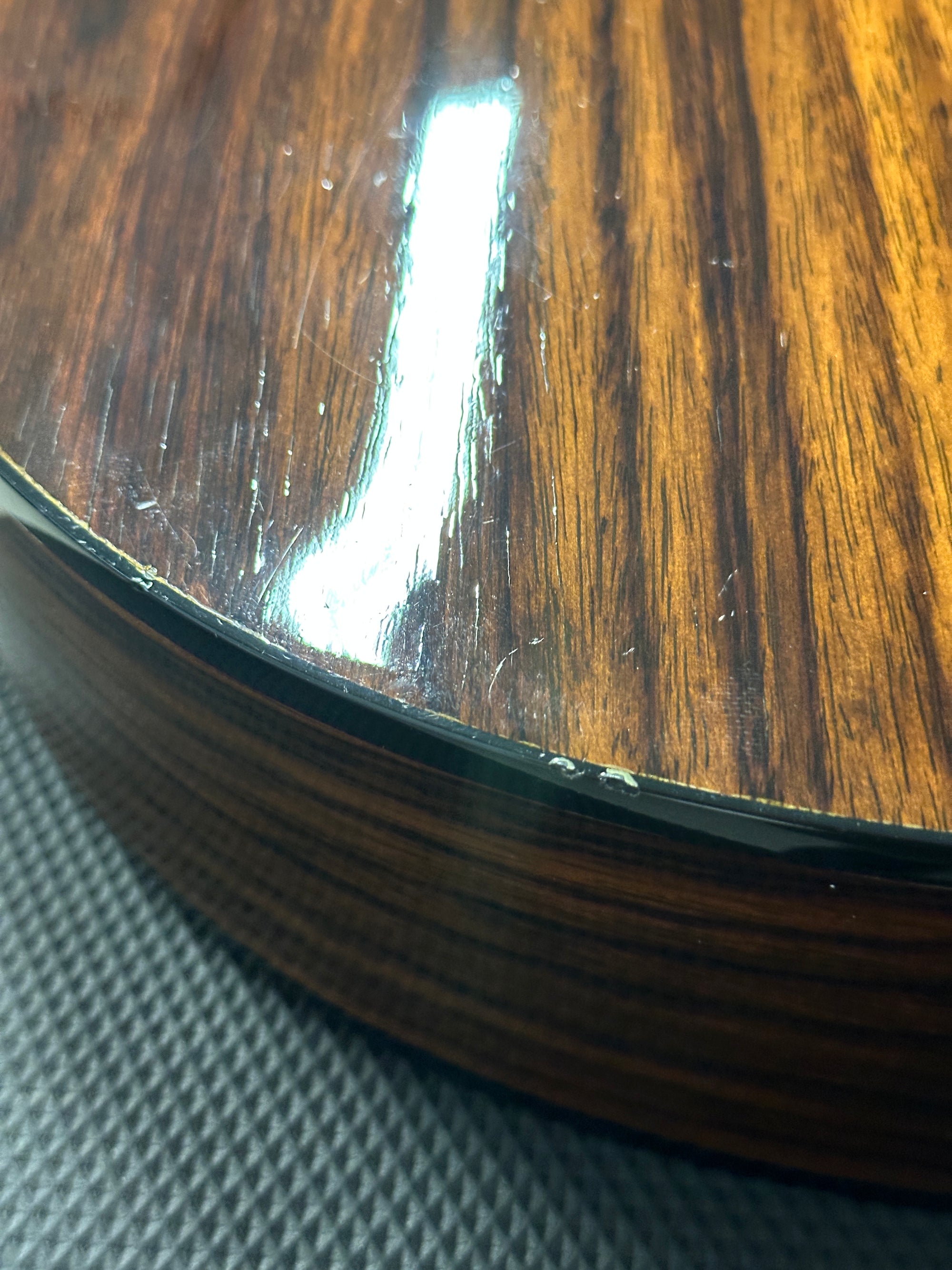 Note: After close inspection, this instrument has scratching, chips, impressions, impacts/chips, and scuffs throughout. Headstock has a larger chip/impact on the top back. Some binding and finish separation and scuffing around the neck heel and cutout. (See pics, light reflections used to show wear)
