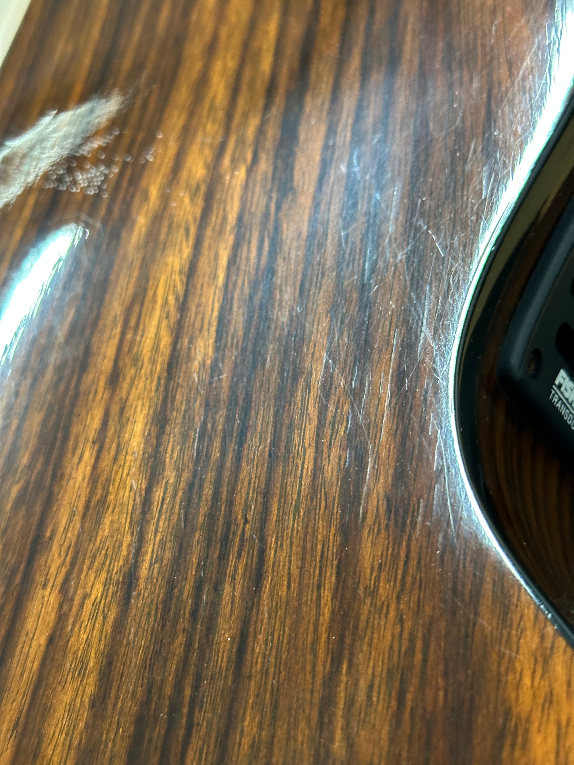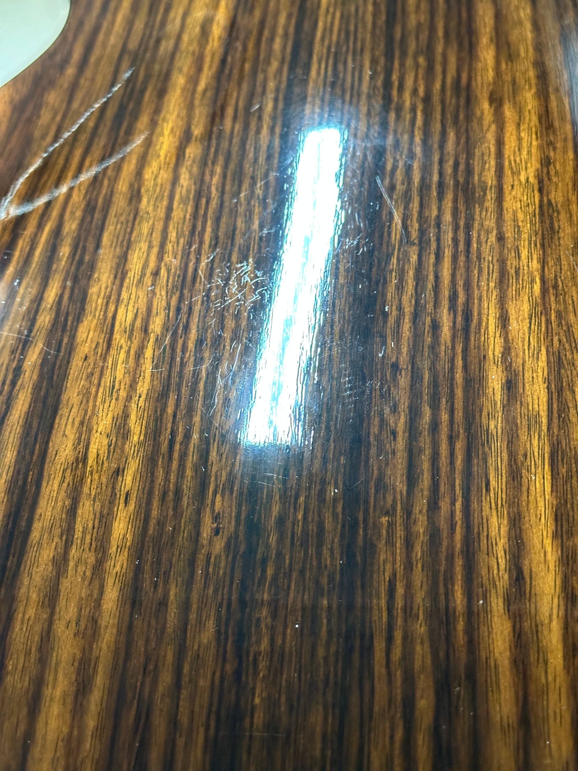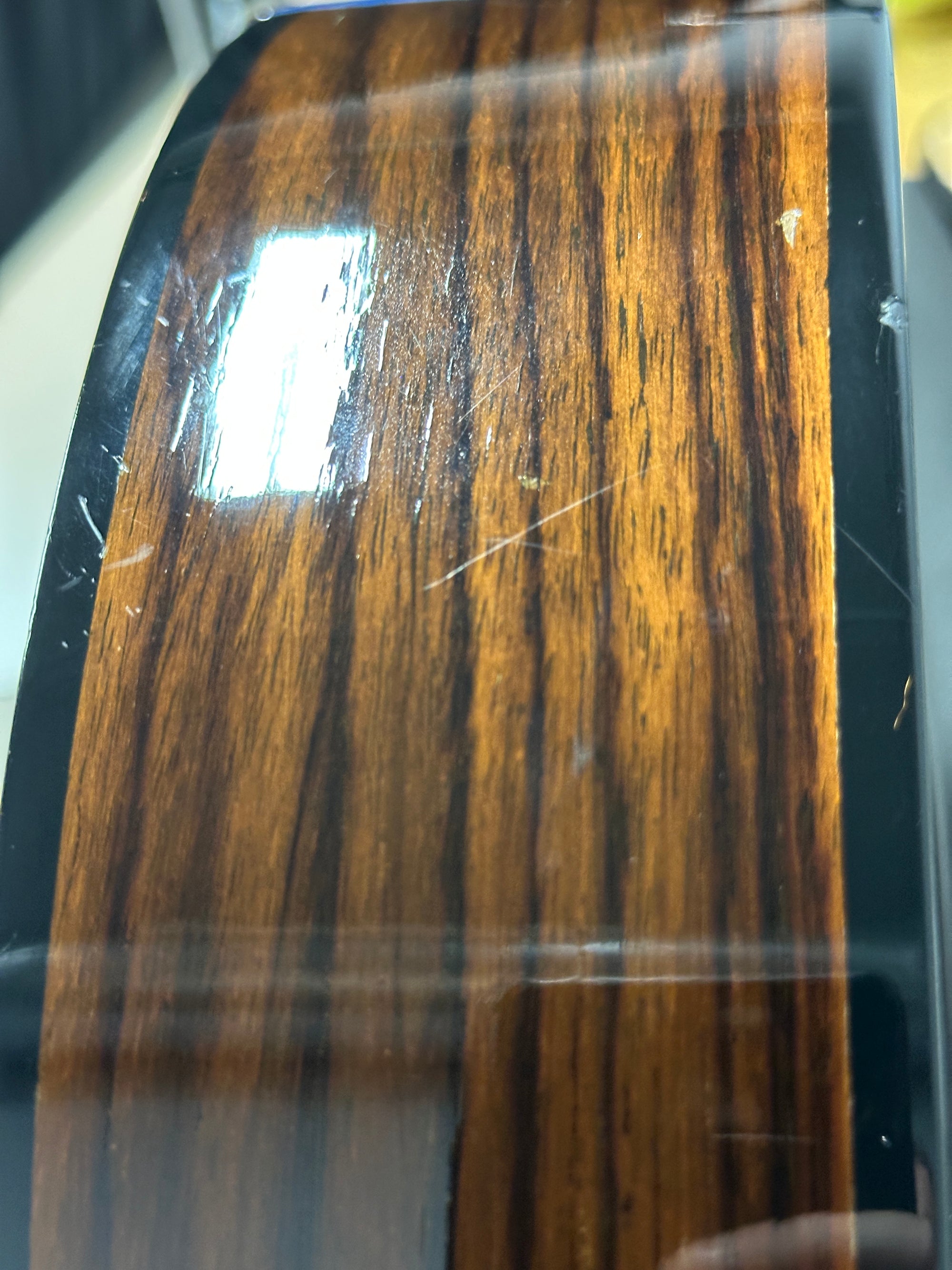 Note: After close inspection, this instrument has scratching, chips, impressions, impacts/chips, and scuffs throughout. Headstock has a larger chip/impact on the top back. Some binding and finish separation and scuffing around the neck heel and cutout. (See pics, light reflections used to show wear)