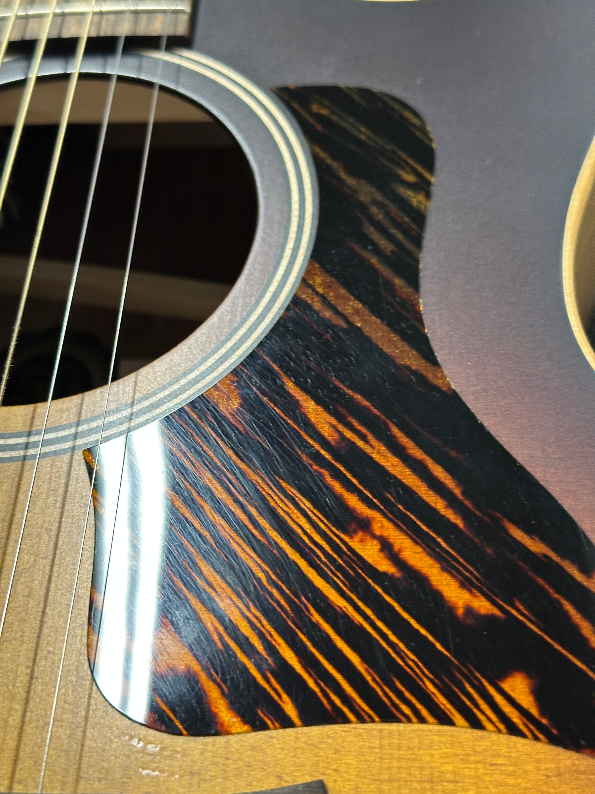 The AD14ce-SB LTD was crafted in celebration of Taylor’s 50th anniversary. This U.S.-made model, featuring a solid walnut/spruce wood pairing, hand-sprayed tobacco sunburst top and firestripe pickguard, delivers a playing experience as musically satisfying as its visual allure.
