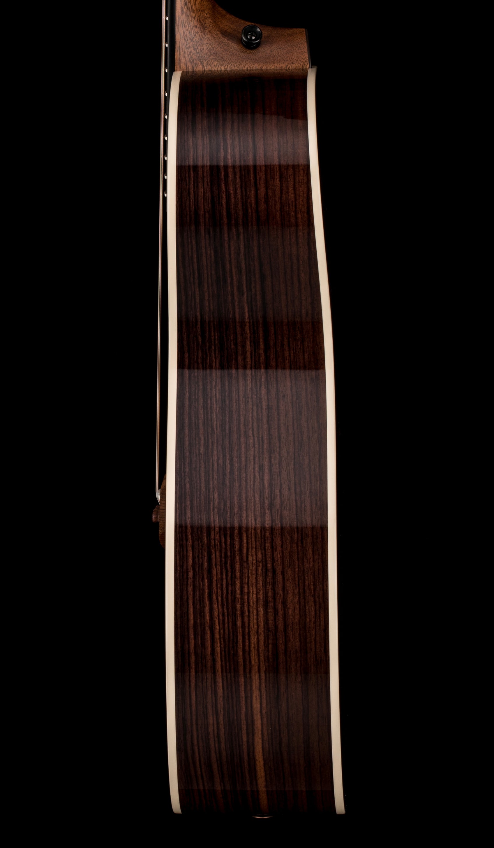 “I wanted to feature the classic Grand Concert shape in its full, non-cutaway form and give it a warmer, more blended voice. By adding a bit of body depth, we increased the air resonance to enhance the warmth and low end, then voiced a smaller fanned V-Class top and back to work in tandem with the long-tenon Action Control Neck. The result feels instantly familiar in size and balance, yet delivers a richer, more robust sound — with clear focus and a surprisingly strong lower register for a Grand Concert.”