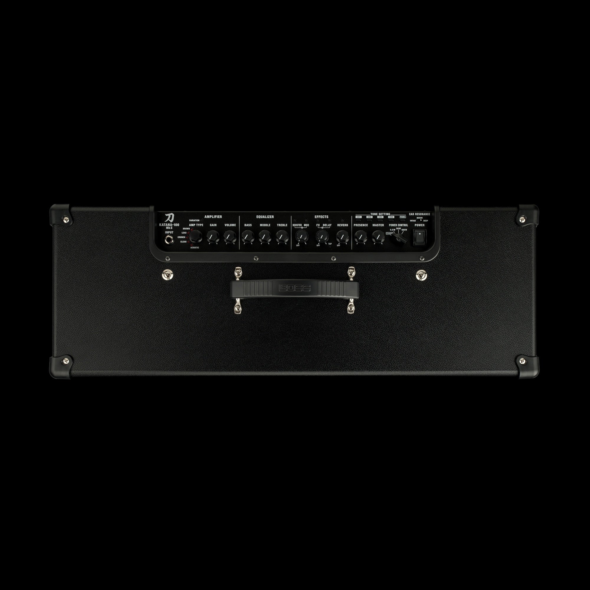 Controls POWER switch PRESENCE knob MASTER knob SOLO button POWER CONTROL switch (STANDBY, 0.5 W, HALF, MAX) CAB RESONANCE switch (VINTAGE, MODERN, DEEP) AMPLIFIER VARIATION button AMP TYPE switch (ACOUSTIC, CLEAN, PUSHED, CRUNCH, LEAD, BROWN) GAIN knob VOLUME knob EQUALIZER CONTOUR button BASS knob MIDDLE knob TREBLE knob EFFECT BOOSTER button MOD button FX button DELAY button REVERB button TAP button BOOSTER knob MOD knob FX knob DELAY knob REVERB knob TONE SETTING CH1 button CH2 button CH3 button CH4 button PANEL button STEREO EXPAND STEREO EXPAND switch