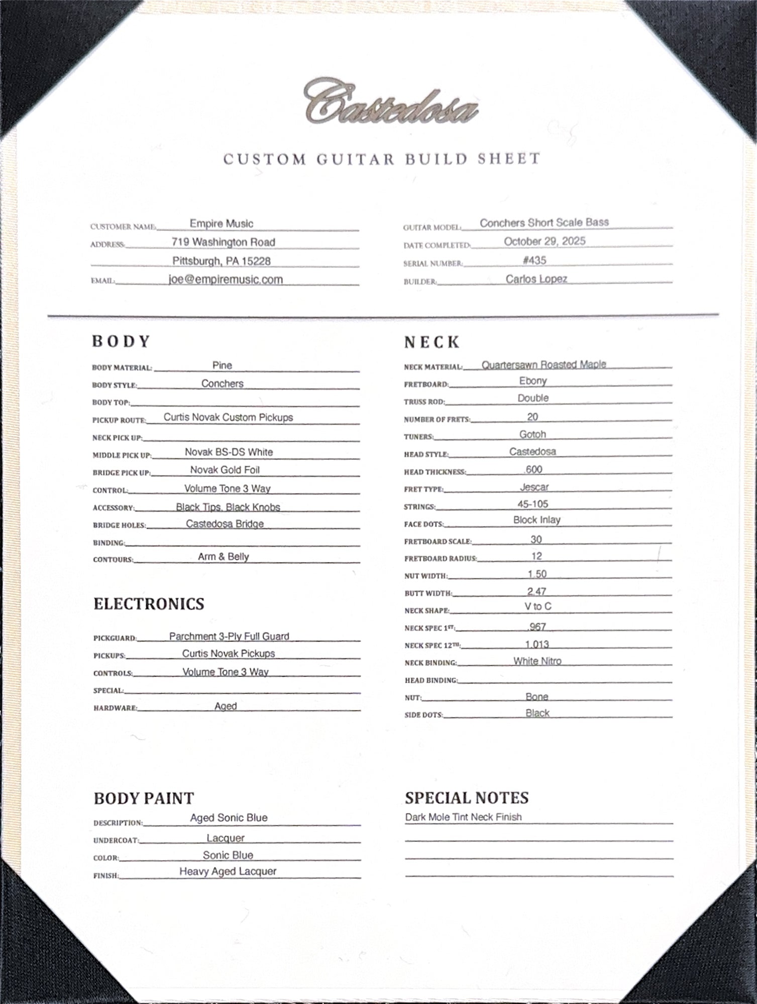 The Conchers Bass follows the Castedosa Baritone Conchers Body shape. It came to life with the desire to bring bass players an instrument that inspires. Ebony in the fretboard was specifically chosen for the subtle special sound it brings. Paired with Curtis Novak pickups the final product is one of a kind.