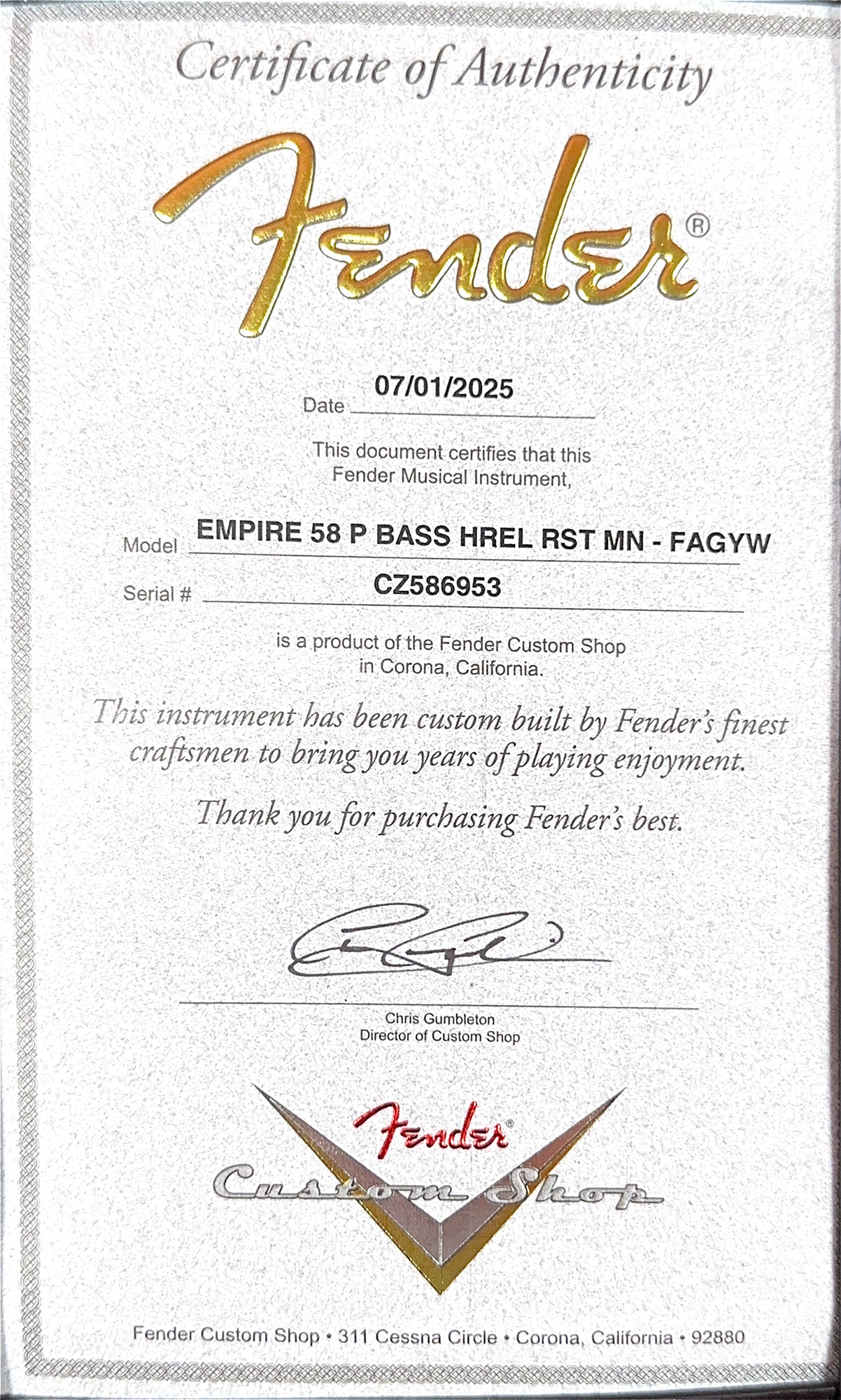 The Fender Custom Shop Empire 58 Precision Bass was designed in-house by our resident bassist and Director of Sales, Anthony Pecora. Based off of his very own 58 Custom Shop P with a few nods to the 60’s models, this bass takes the best from both eras into a player-centric package.