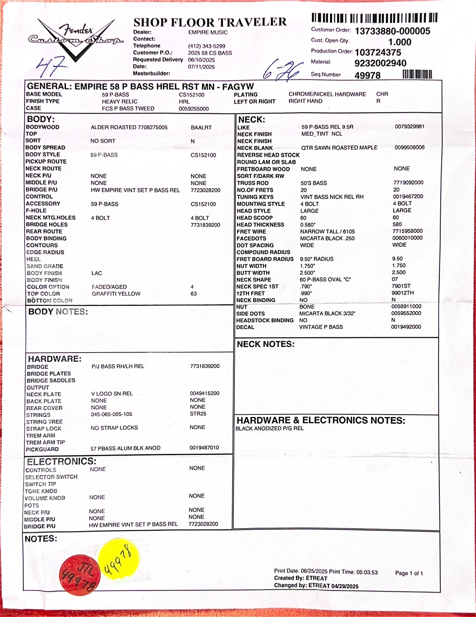 Fender Custom Shop Empire '58 Precision Bass Heavy Relic, Roasted Maple Neck, Faded Aged Graffiti Yellow
