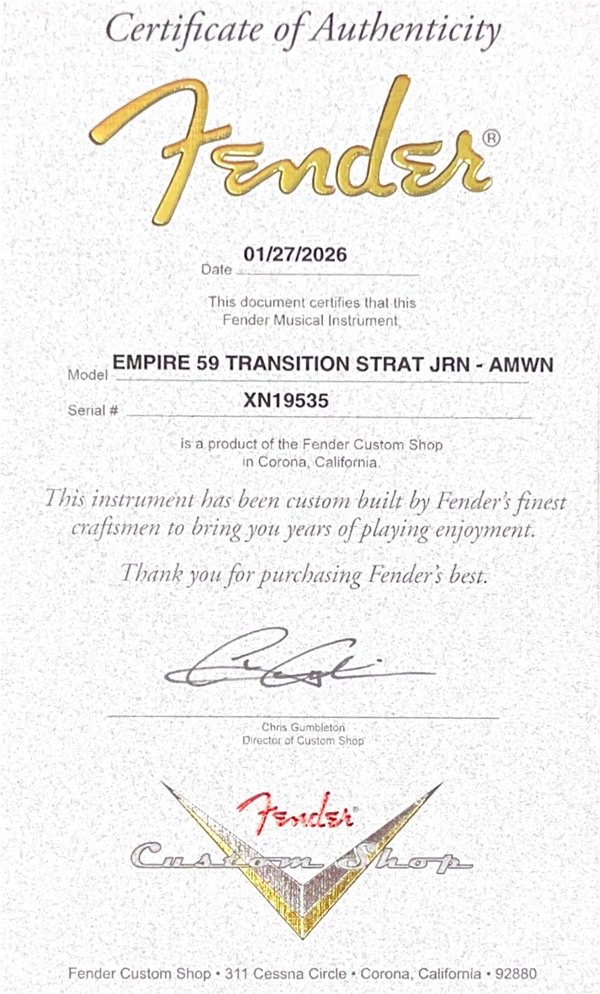 “For over 25 years, the Strat has been my go-to. The look, sound, and versatility of the Stratocaster, and the iconic heroes who play them, has been at the foundation of my experience as a musician. The Empire ‘59 Transition Strat draws on everything I love about the most expressive guitars ever made. Players will appreciate the familiar played-in neck and body feel, and the maturity and sweetness of our hand wound ‘59 pickups. These Strats are among the best I’ve played, and are a tribute to the deep connection between the Fender Stratocaster and the musicians who play them” - Justin, Empire Music