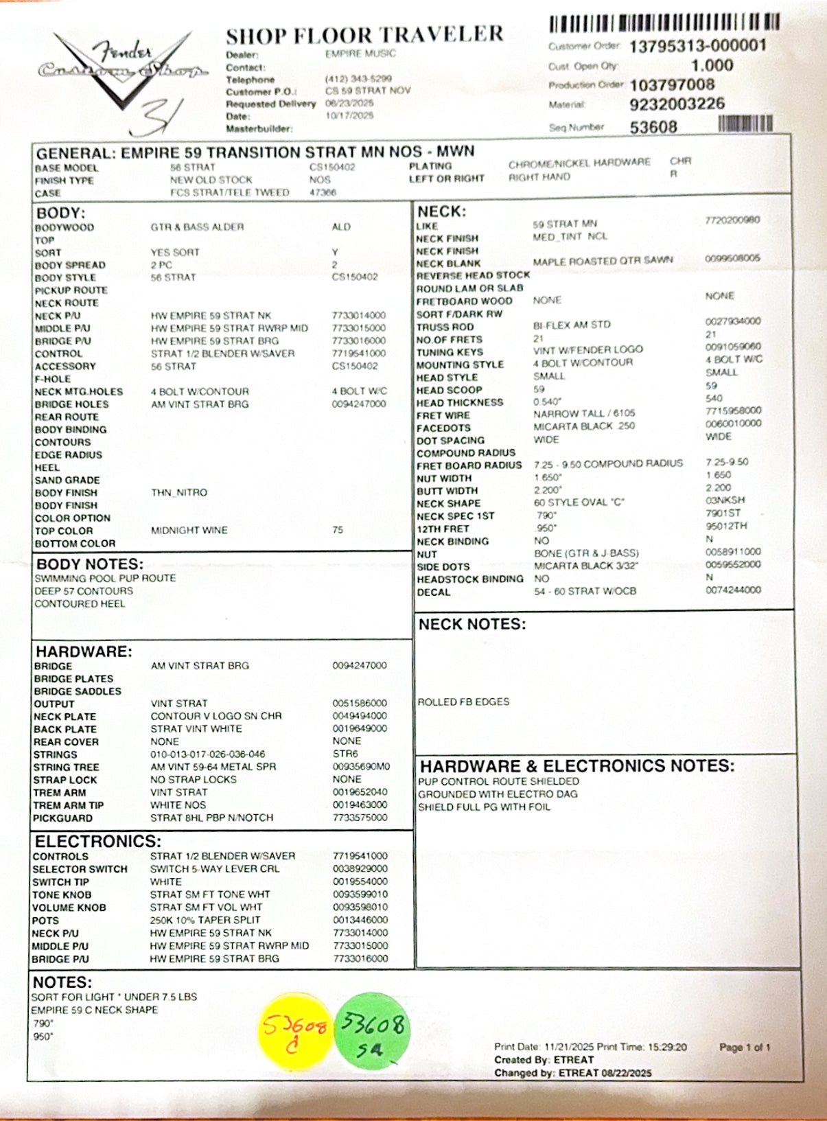 Fender Custom Shop Empire 59 Transition Stratocaster NOS - Midnight Wine #19367